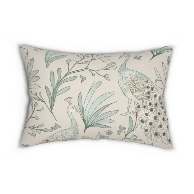 Peacocks, Spun Polyester Lumbar Pillow. Add this beautiful spun-polyester lumbar pillow to your home decor pieces today. It comes with a stuffing pillow included. The casing is made of a spun polyester fabric that is inherently mildew and water-resistant. You can place your design on both sides or have a different design on each side. It has a hidden beige zipper to maintain a finished and stylish look.