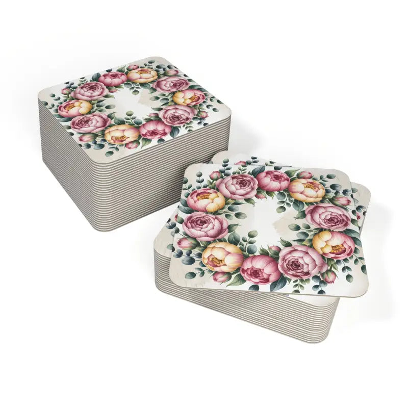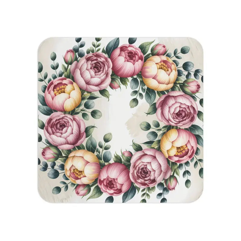 Print: Features a detailed peony floral wreath motif for a timeless, eye-catching look on each coaster.
