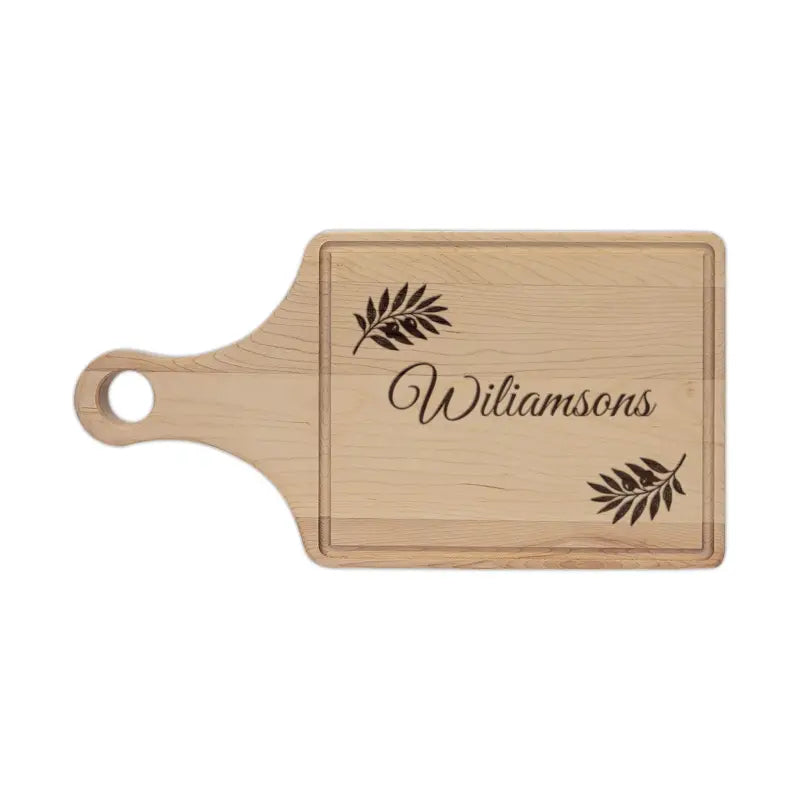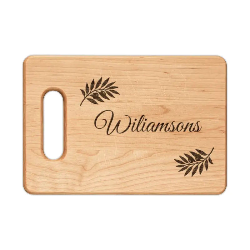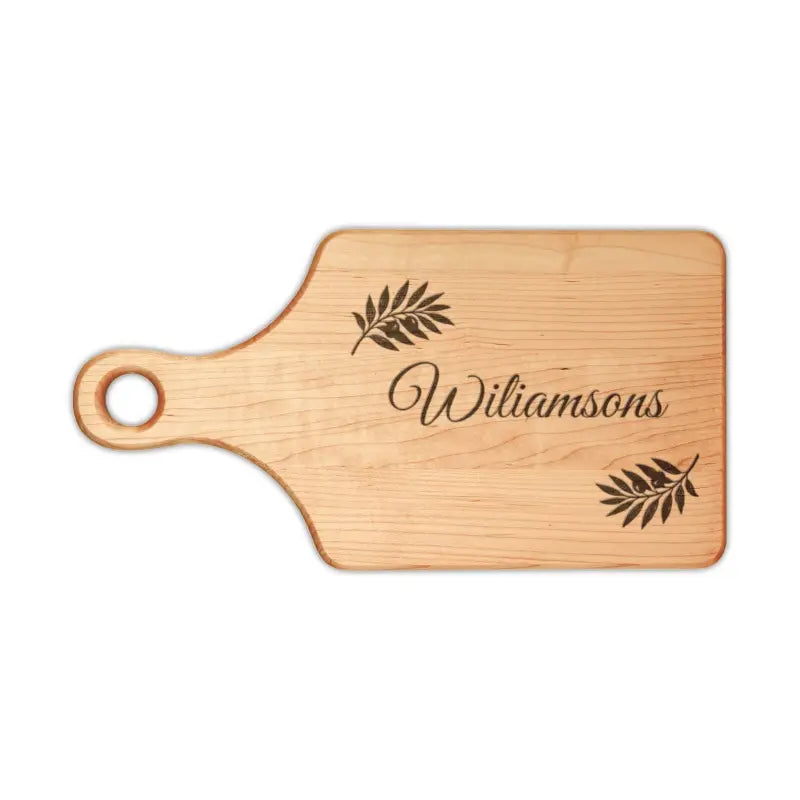 A warm, engraved wooden cutting board that brings calm, everyday beauty to the kitchen. Smooth walnut or maple grain catches the light while a subtle scripted name and delicate leaf accents are laser-etched into the surface. It’s the kind of board you reach for when guests arrive or when you’re prepping a slow Sunday meal — solid under your hands, quietly personal, crafted to age gracefully with use. The two shape options let you choose a sturdy rectangle with a built-in handle or a charming paddle with a round grip hole, both finished for a natural, tactile feel. Keep it hand-washed and oiled occasionally to preserve the wood’s luster and the crisp engraved details.