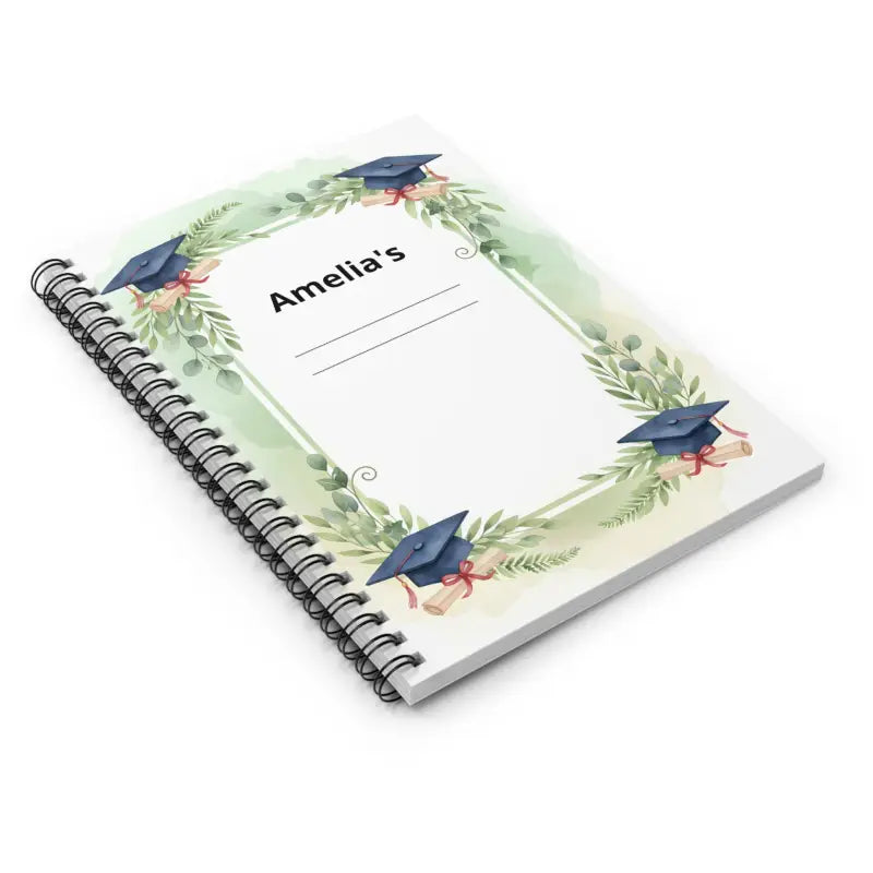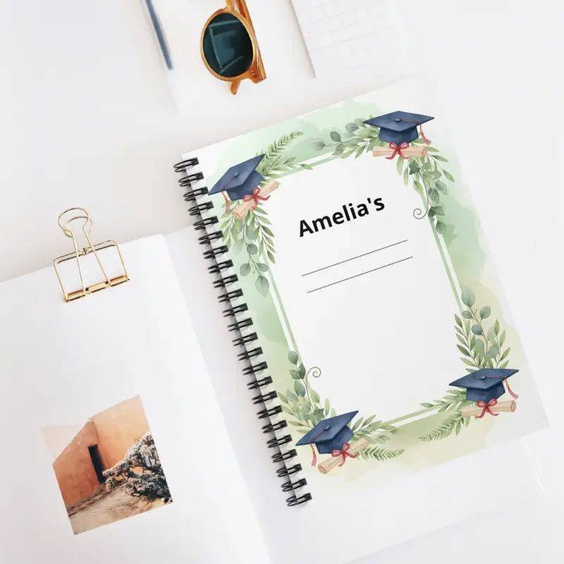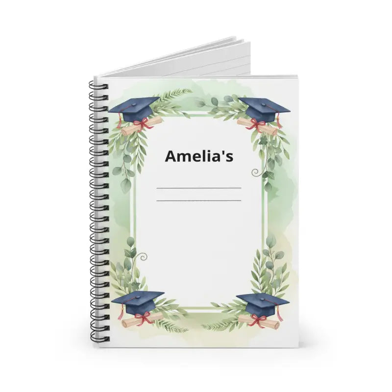 Inspired by the joy of achievement and the beauty of new beginnings, this personalized graduation keepsake wraps you in calm celebration every time you open it. Gentle watercolor botanicals frame each page while tiny graduation caps whisper congratulations with every glance. The ruled pages guide your pen with crisp precision, while the sturdy metal spiral lets your notebook lay completely flat for effortless writing. Tuck it into your backpack for class notes, keep it on your desk for daily reflections, or fill it with messages from loved ones at your graduation party. Inside, a built-in document pocket holds photos, ceremony programs, and small mementos that mark your journey. DipaliZ creates this notebook with thoughtful attention to sustainable practices, ensuring your celebration leaves a positive footprint on the planet.