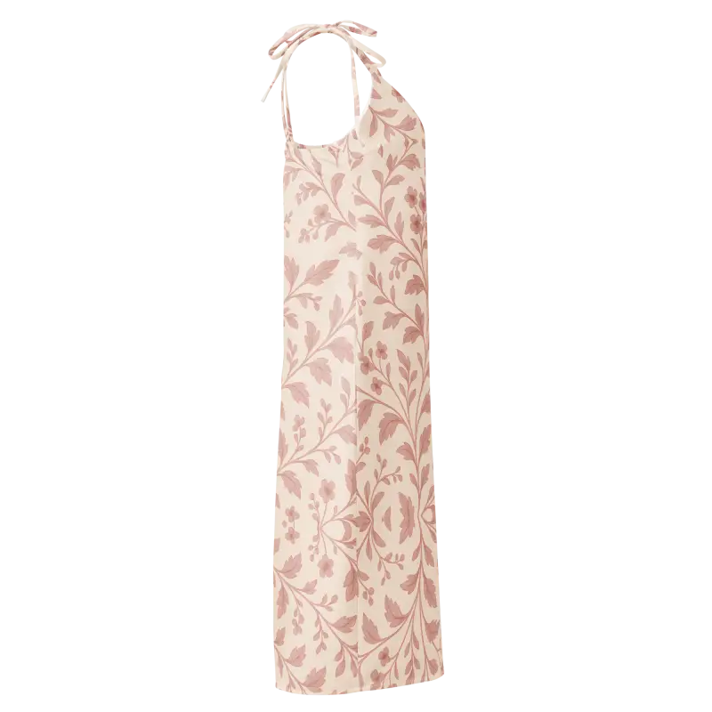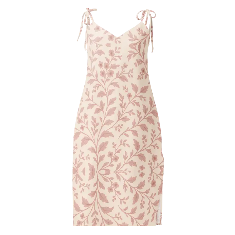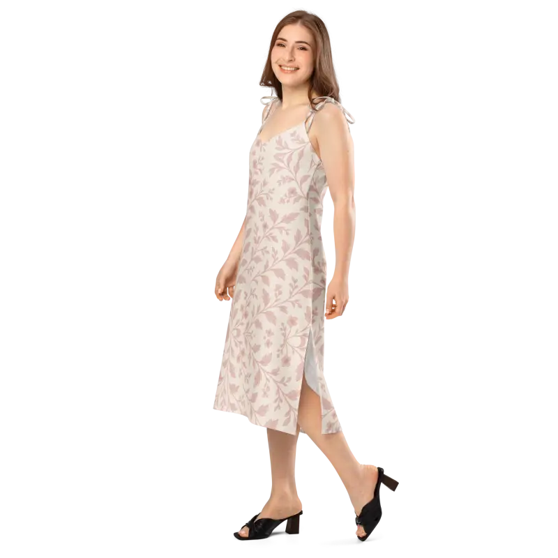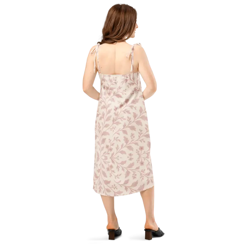 Whether you're stepping out for an indoor event or enjoying the outdoors, this pink floral vines midi dress with its built-in bra is your go-to choice for effortless charm and comfort.