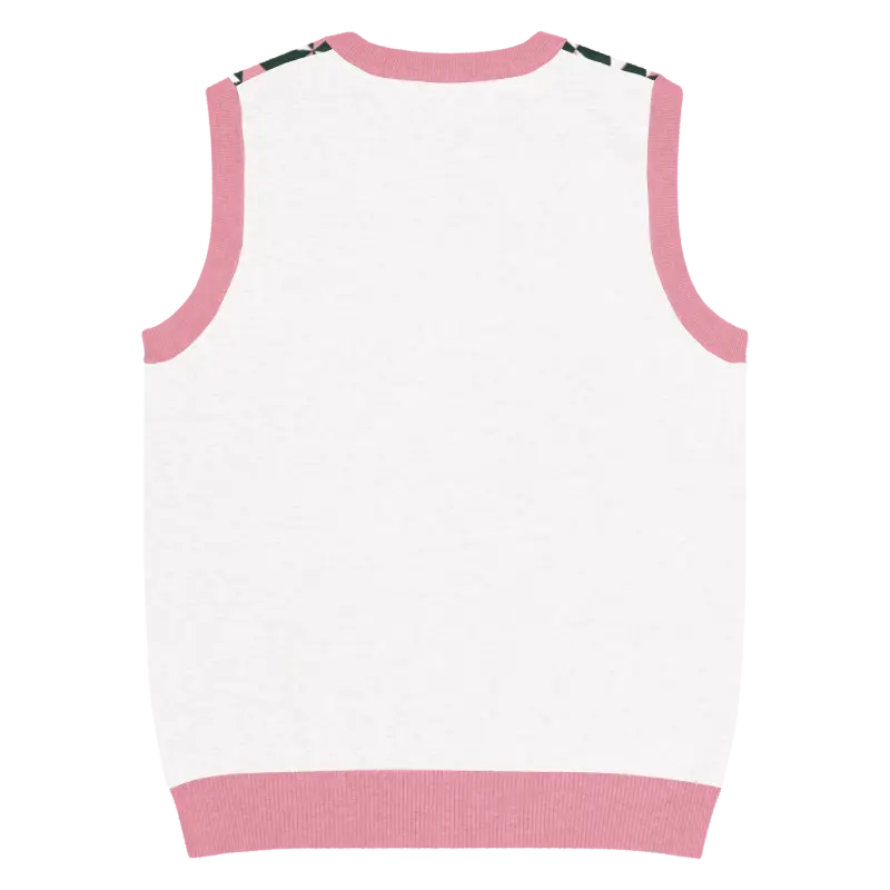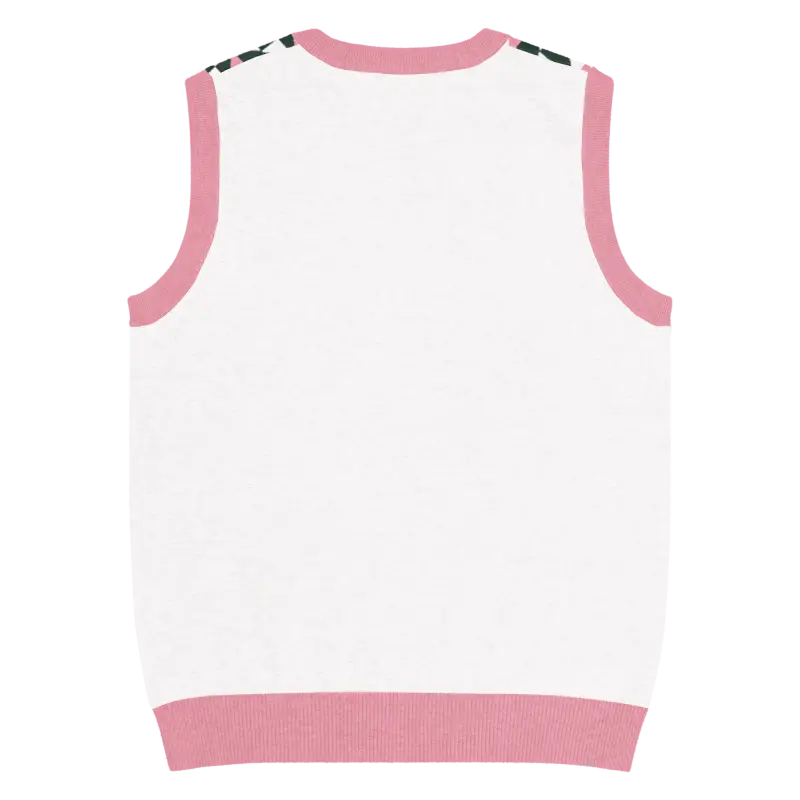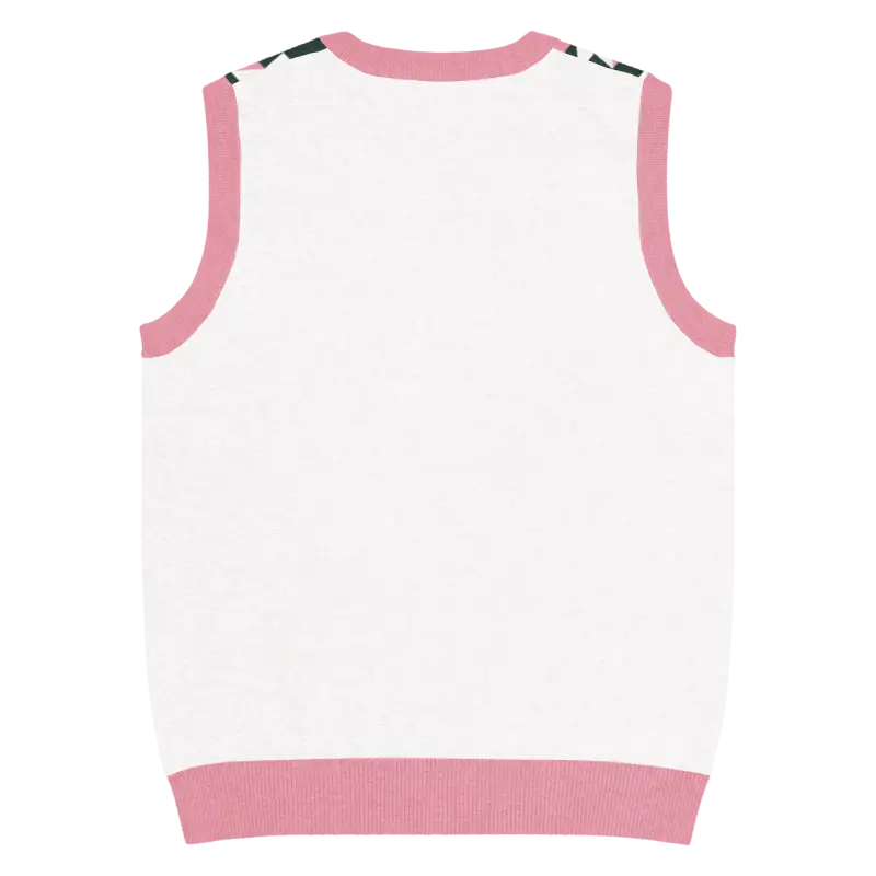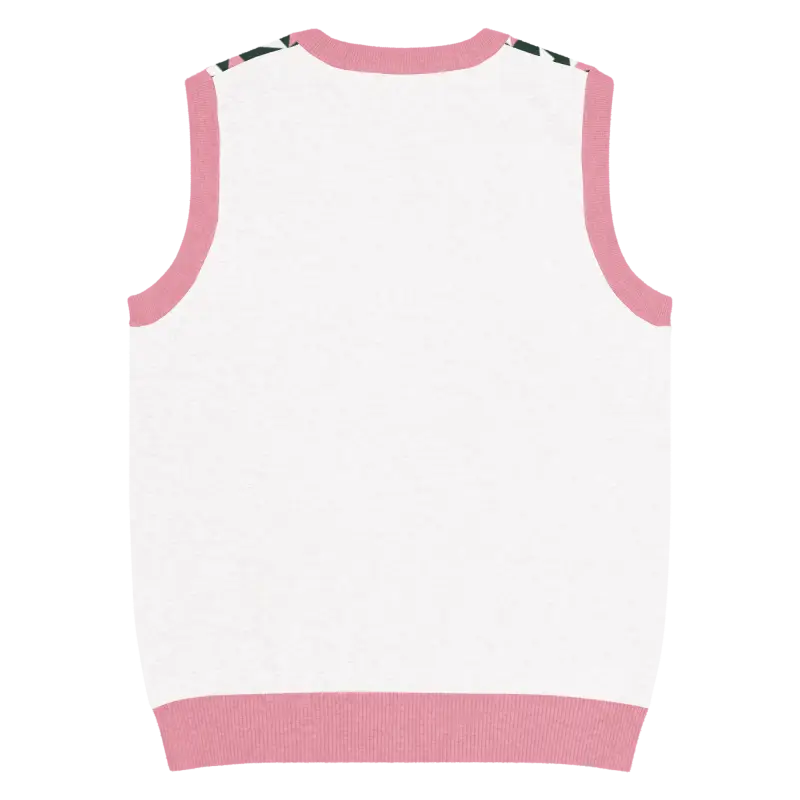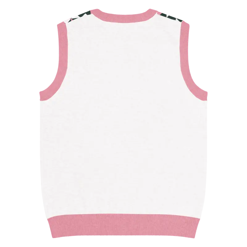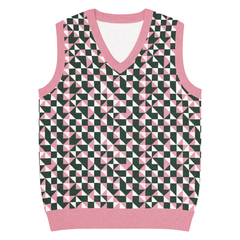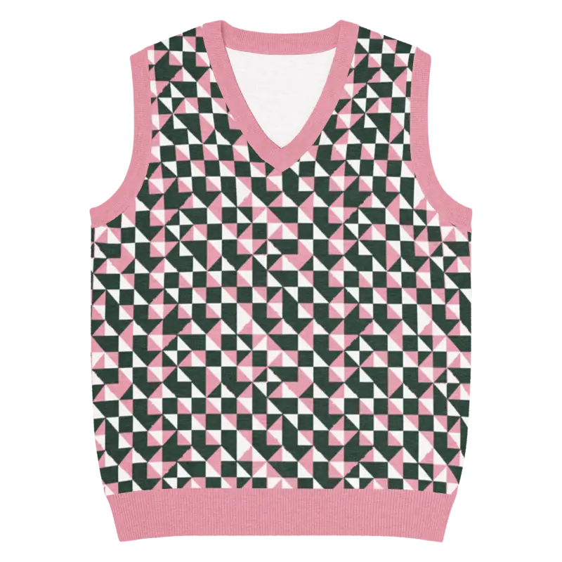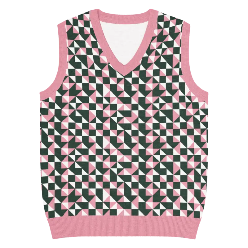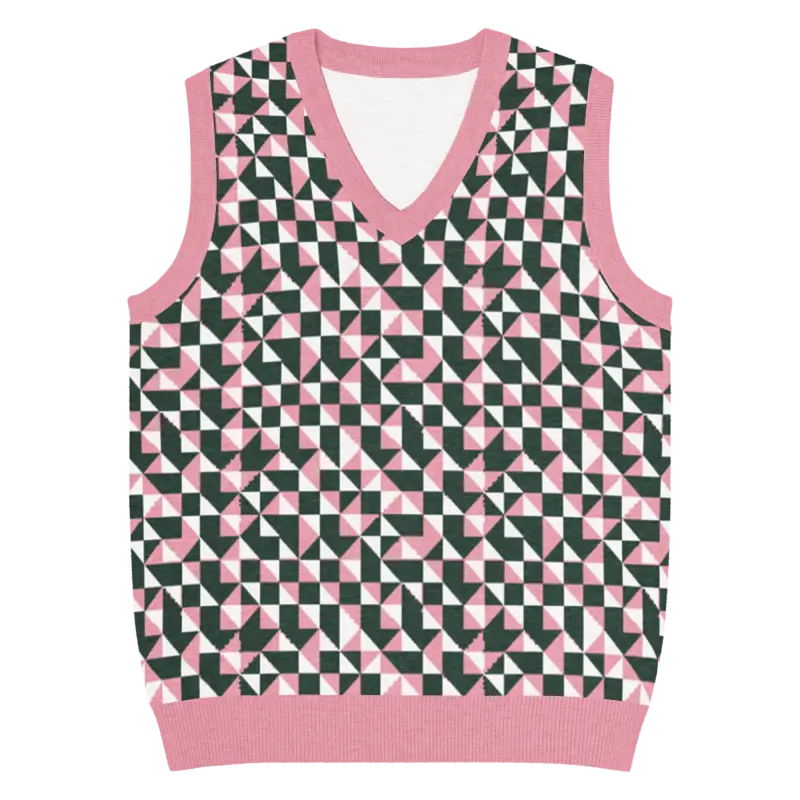 Get ready to revolutionize your layering game with this stunning knit v-neck vest that brings bold pink geometric origami patterns to life. This isn't just another vest – it's your new style statement that effortlessly bridges retro vibes with contemporary edge.