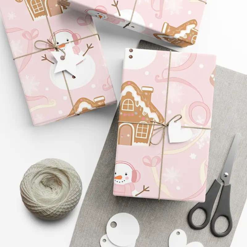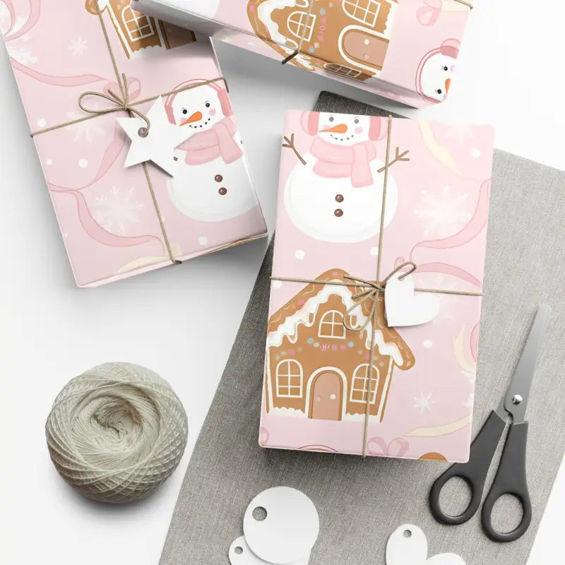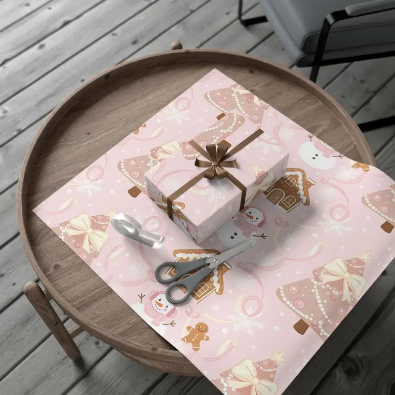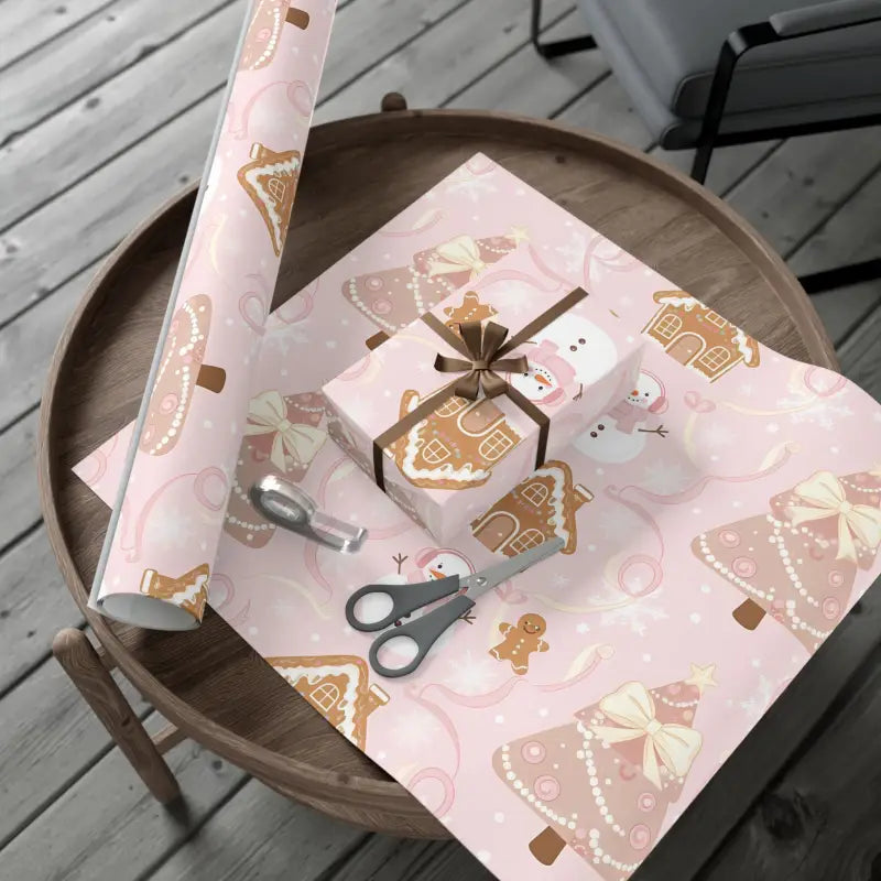 Wrap your presents in pure holiday magic with this pink gingerbread holiday gift wrap, where rosy snowmen and sweet gingerbread houses dance across a soft blush background that feels cozy, fun, and full of cheer.