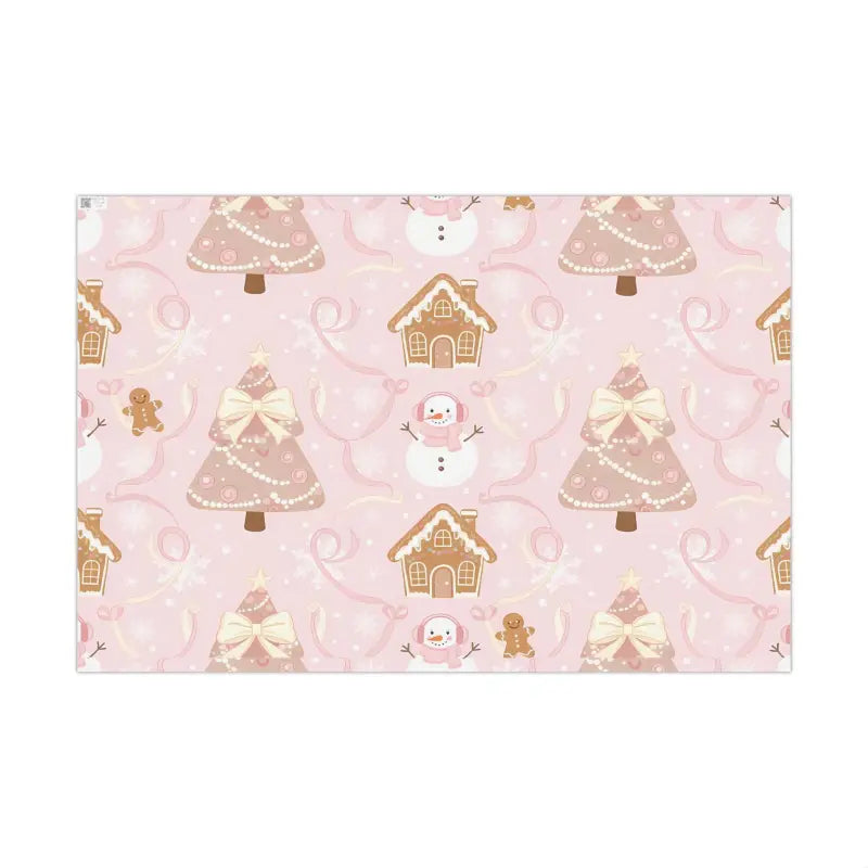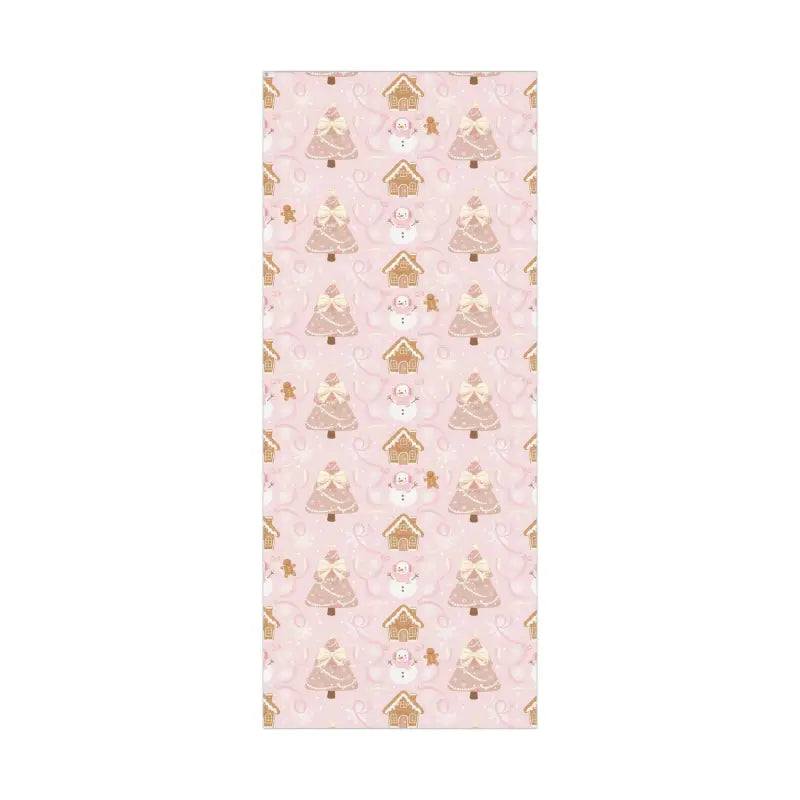 Blush-pink paper with gingerbread houses, snowmen, and Christmas trees in warm holiday hues.