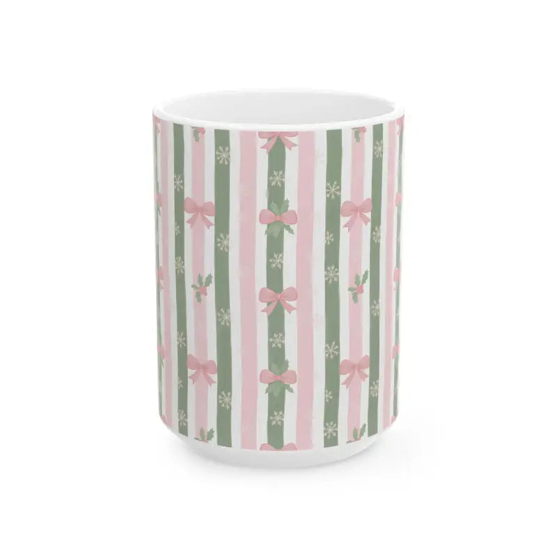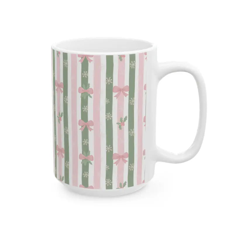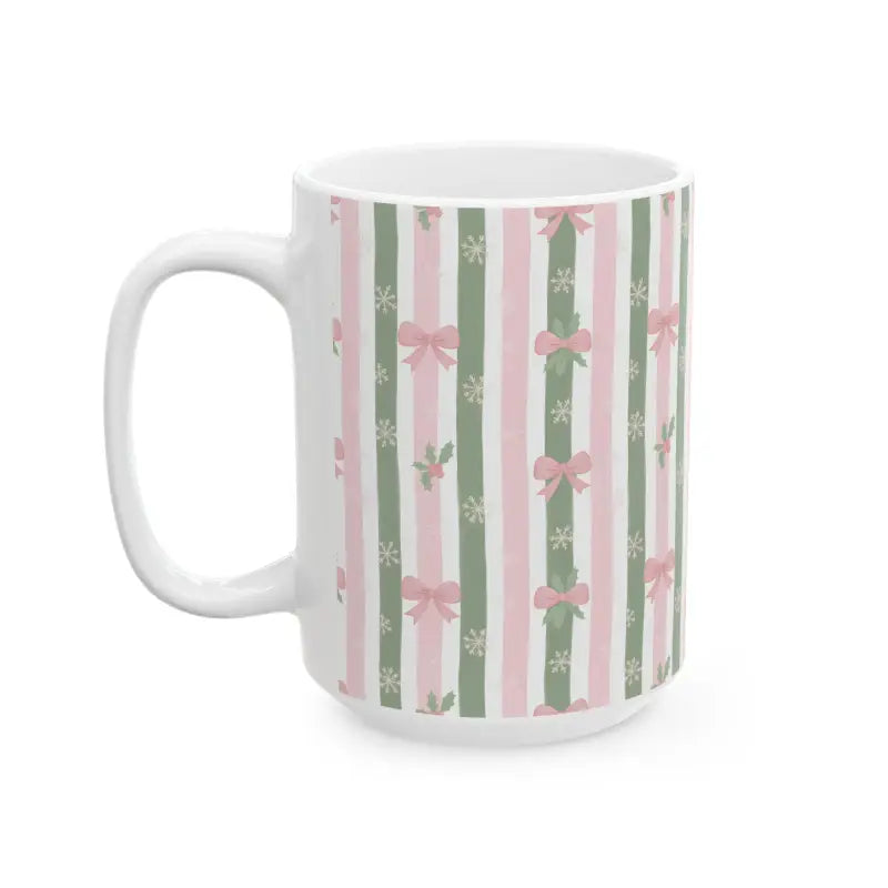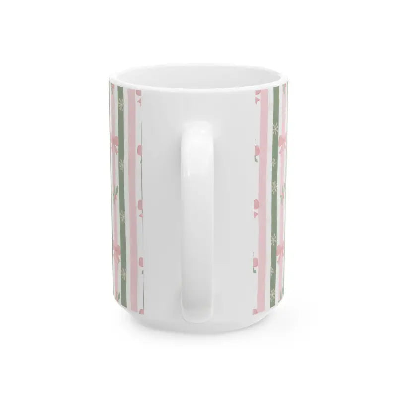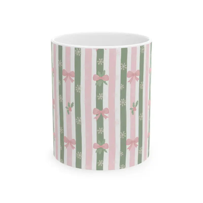 Soft sage green and blush pink stripes dance across premium ceramic, adorned with tiny snowflakes, holly sprigs, and dainty bows. This stripe ceramic mug brings feminine elegance to any season while maintaining that cozy, handcrafted aesthetic you crave.