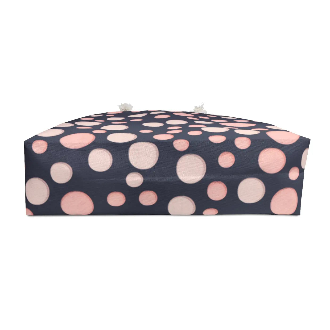 The bold white and pink polka dots pop against a soft blush background, creating an eye-catching statement that flatters every outfit. The roomy shape swallows sweaters, sandals, and snacks with ease while the wide-mouth opening lets you fish out your essentials without digging. Lightweight yet rugged, this tote is built for spontaneous escapes and everyday errands alike.