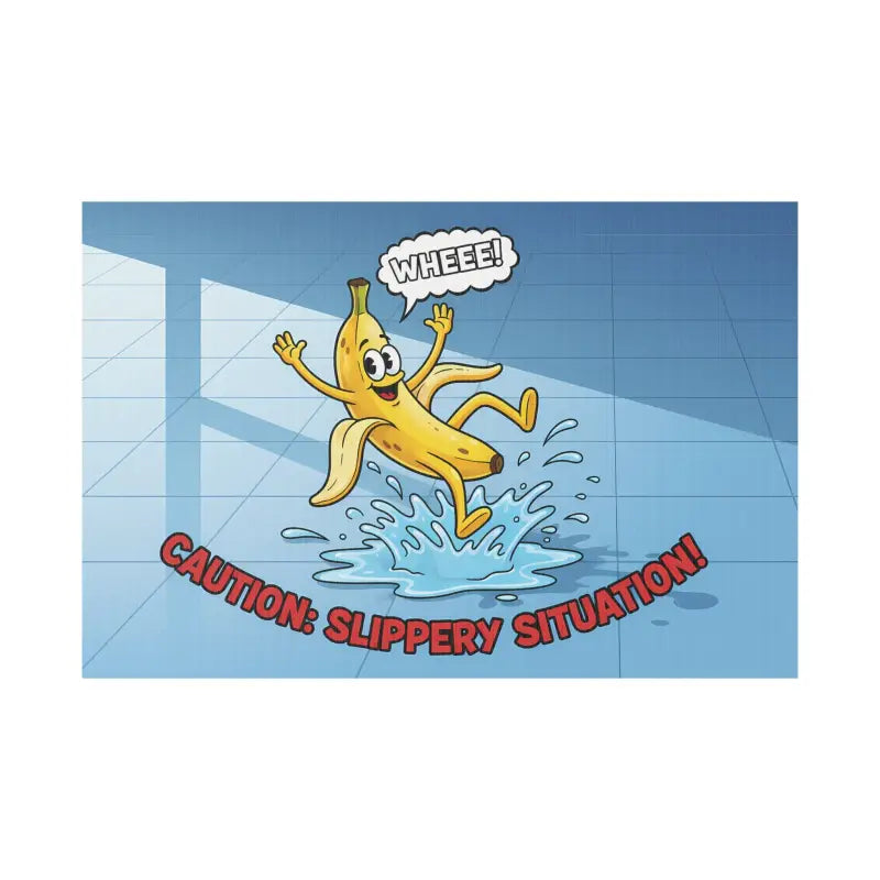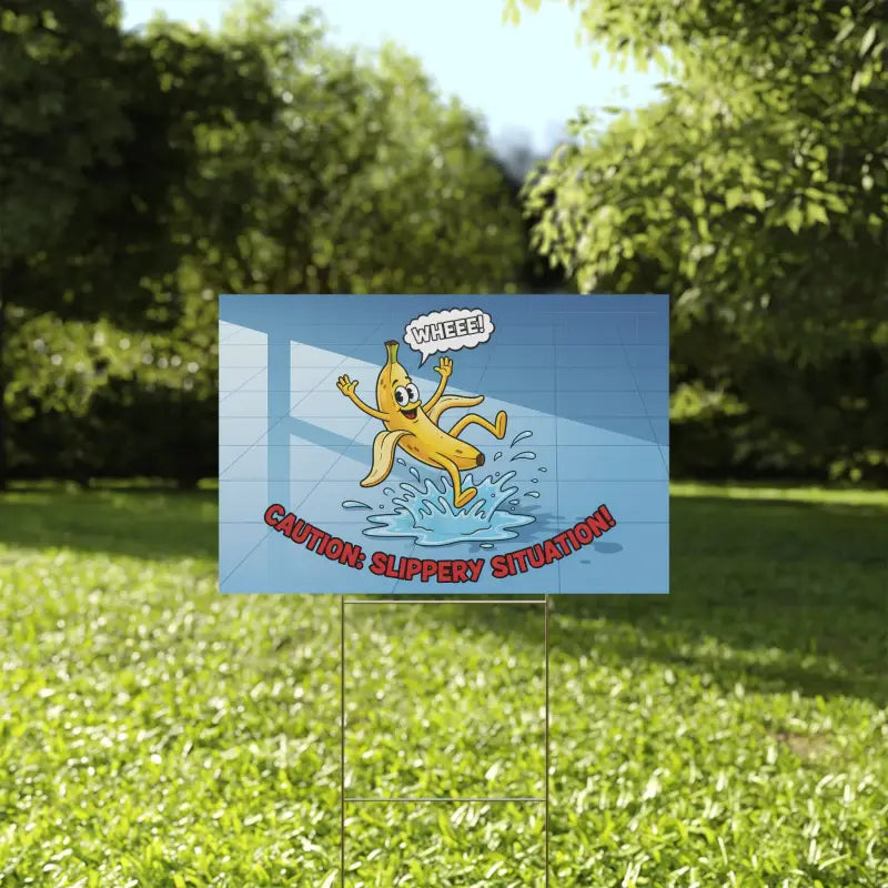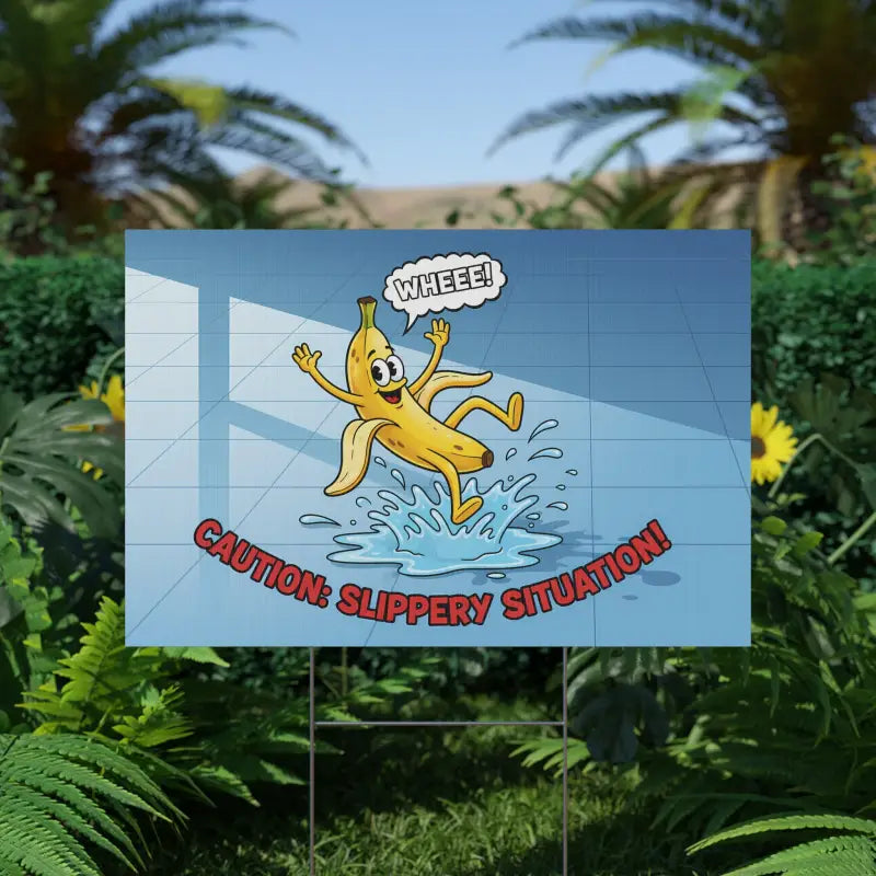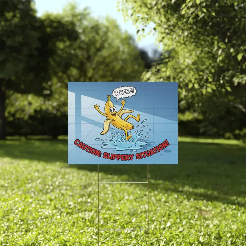 This vibrant slippery situation yard sign pops with bold colors and a playful cartoon that instantly grabs attention from across the lawn or parking lot. The cheeky banana mascot brings smiles while delivering serious slip prevention reminders for wet walkways, freshly mopped floors, or icy patches.