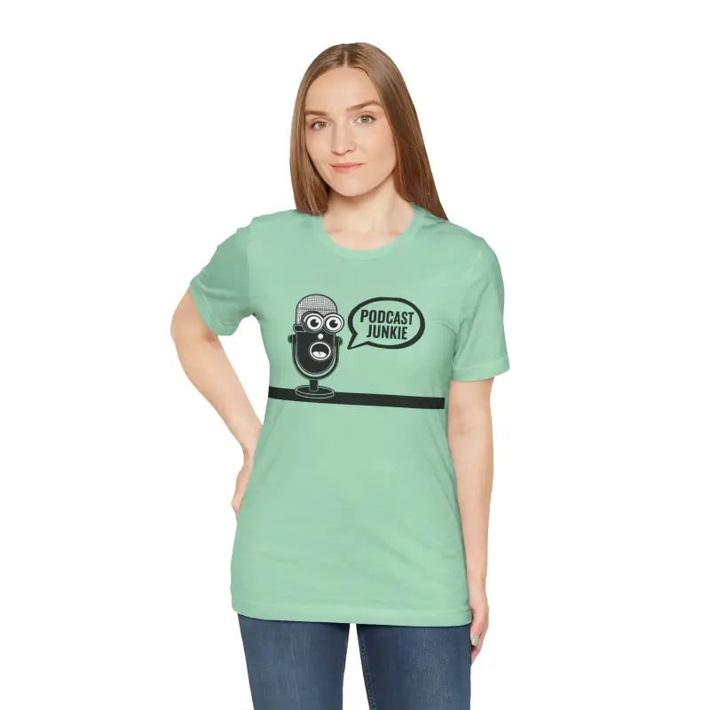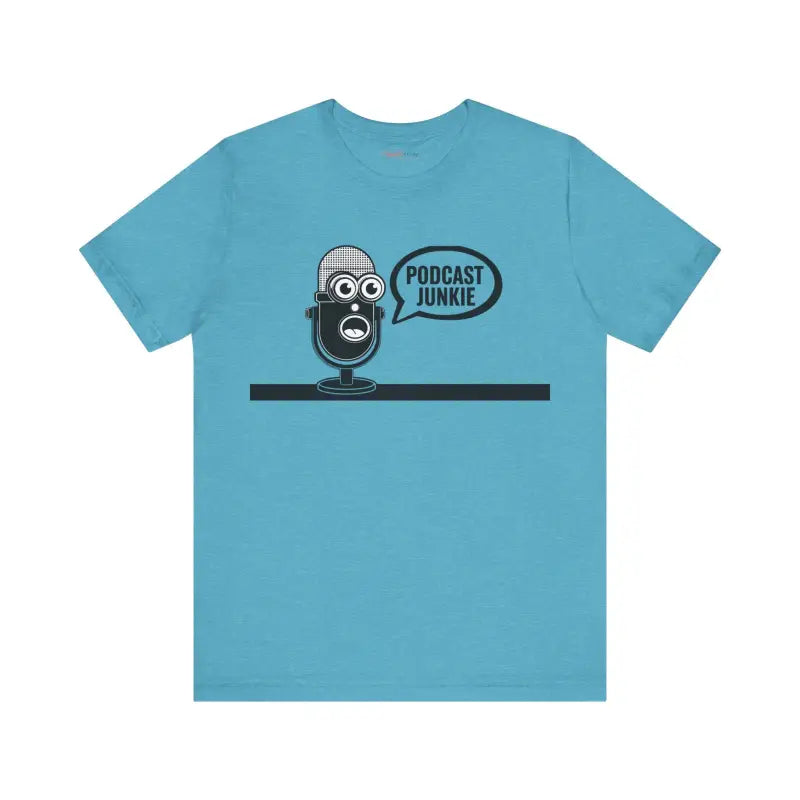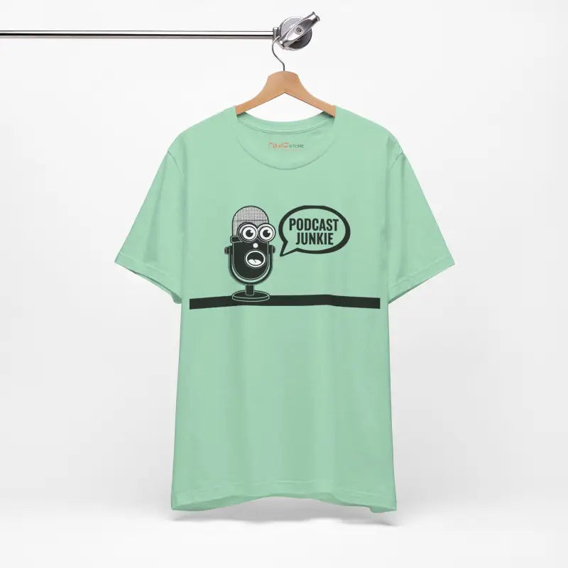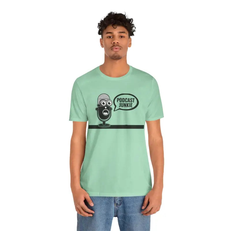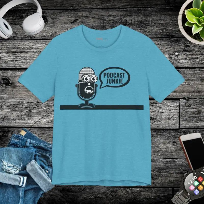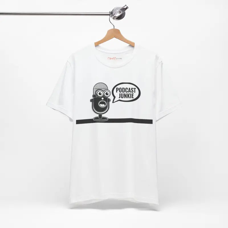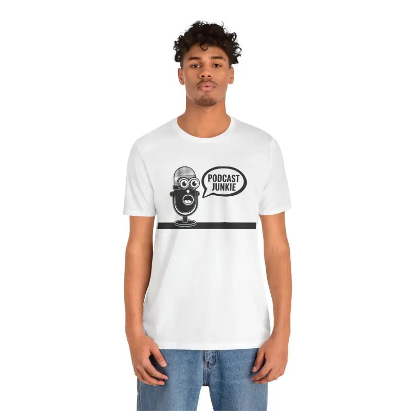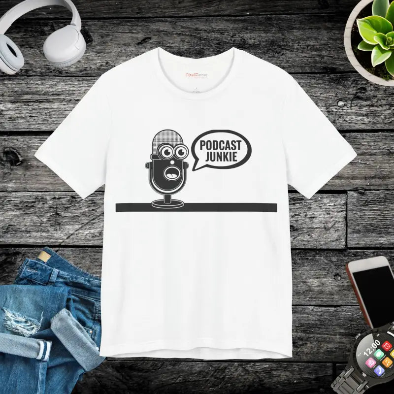Podcast Junkie, Unisex Jersey Short Sleeve Tee. This timeless unisex jersey short sleeve t-shirt offers a familiar and cherished feel. Its gentle cotton and premium print create an enduring affection among wearers. These shirts feature ribbed knit collars for enhanced structure and taped shoulders for lasting fit. The dual side seams further preserve the garment's form.