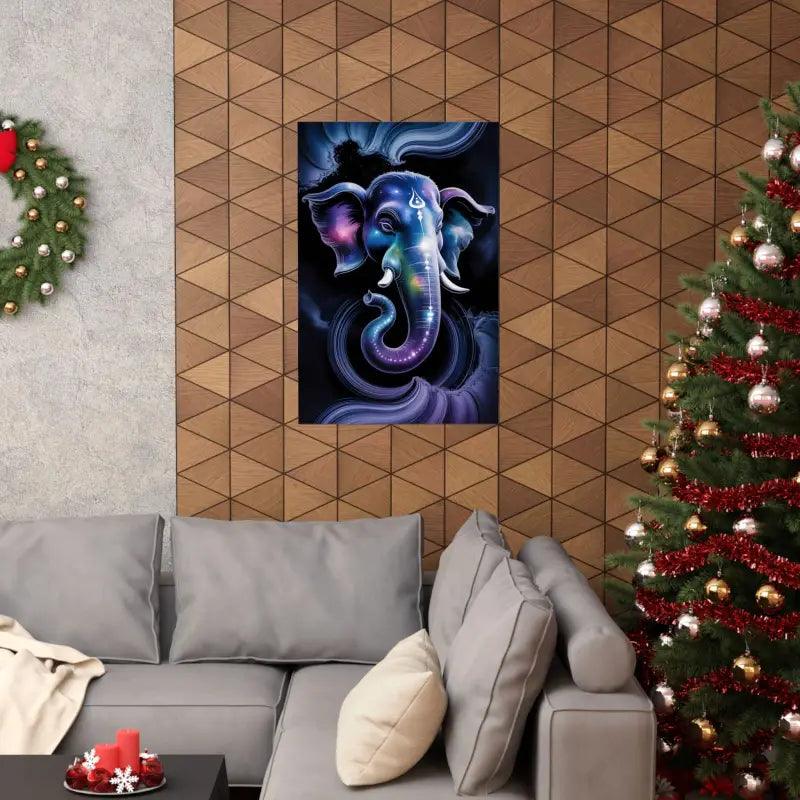 Imagine deep cosmic blues merging with luminous purples while rainbow highlights dance across an elephant-headed guardian floating through celestial realms. This vertical wall art brings mystical energy and artistic sophistication to any room where you seek peace and creative flow.