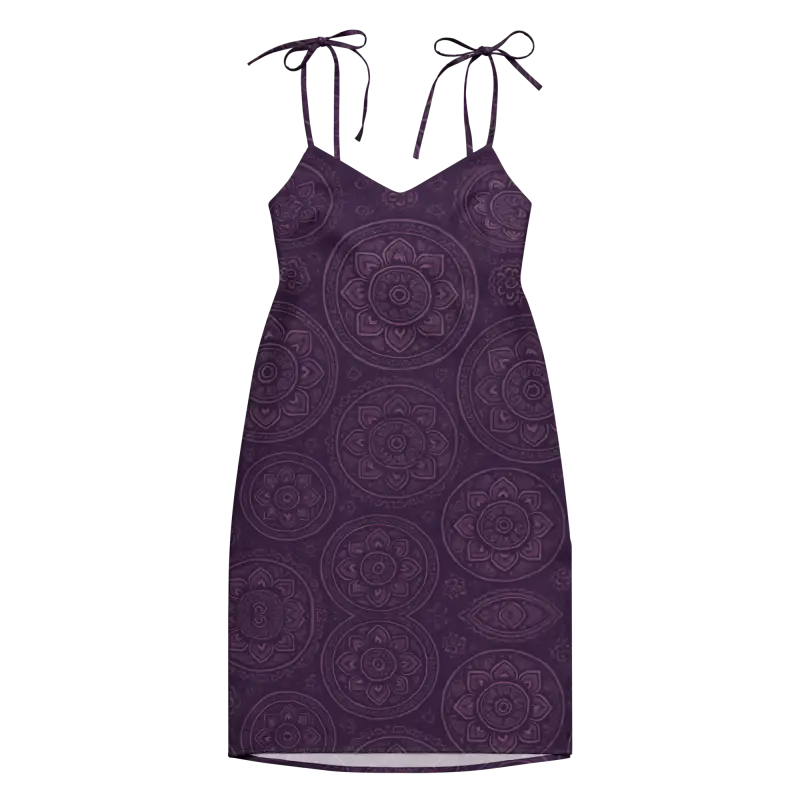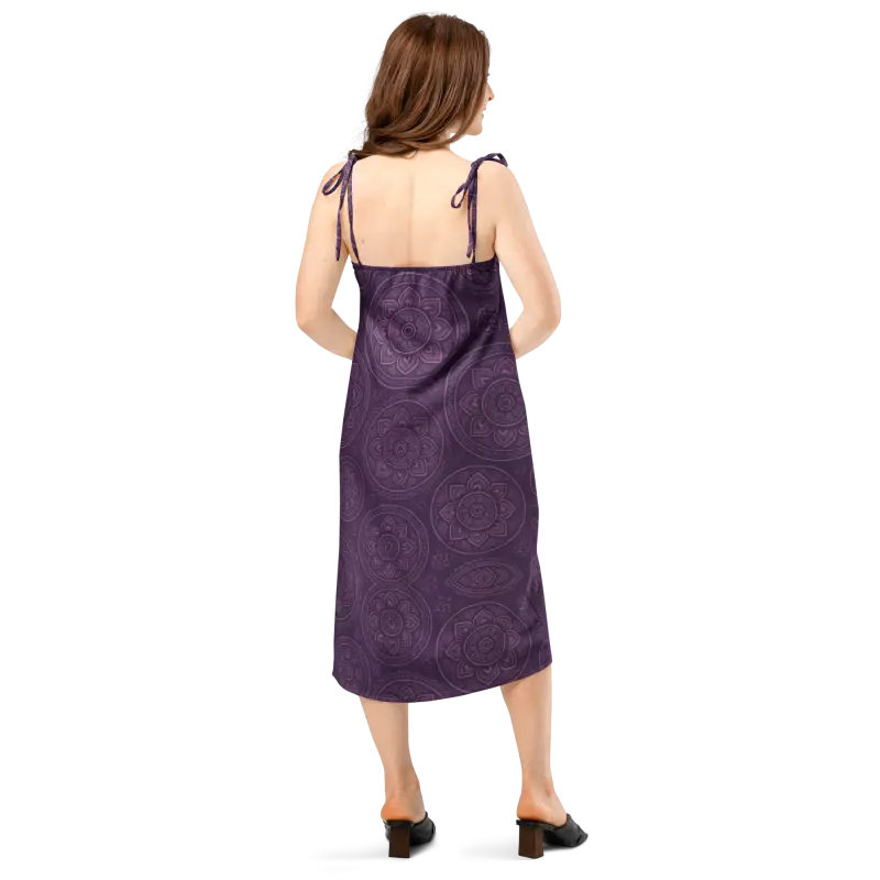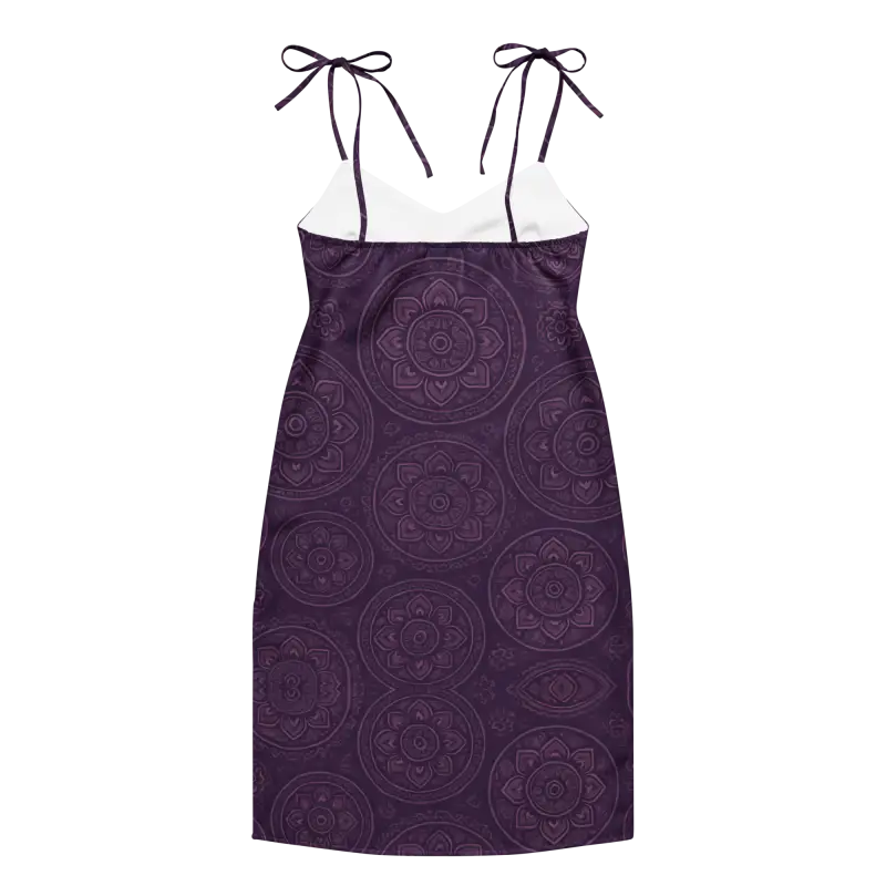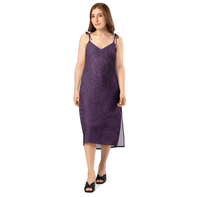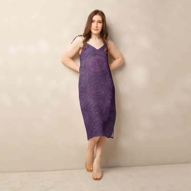 Soft swirls of lavender and lilac bloom across a breezy silhouette, accentuating the midi length with a playful side slit. The adjustable tie straps let you find that perfect fit, while the artful Mandala pattern anchors you in boho-chic confidence wherever you go.