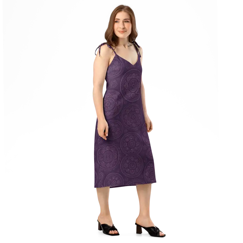 Purple Mandala midi dress floats around you like a soft summer breeze, inviting you to dance through sunlit gardens and moonlit patios in that dreamy purple Mandala pattern. Each step feels like a story unfolding under the warm sky.