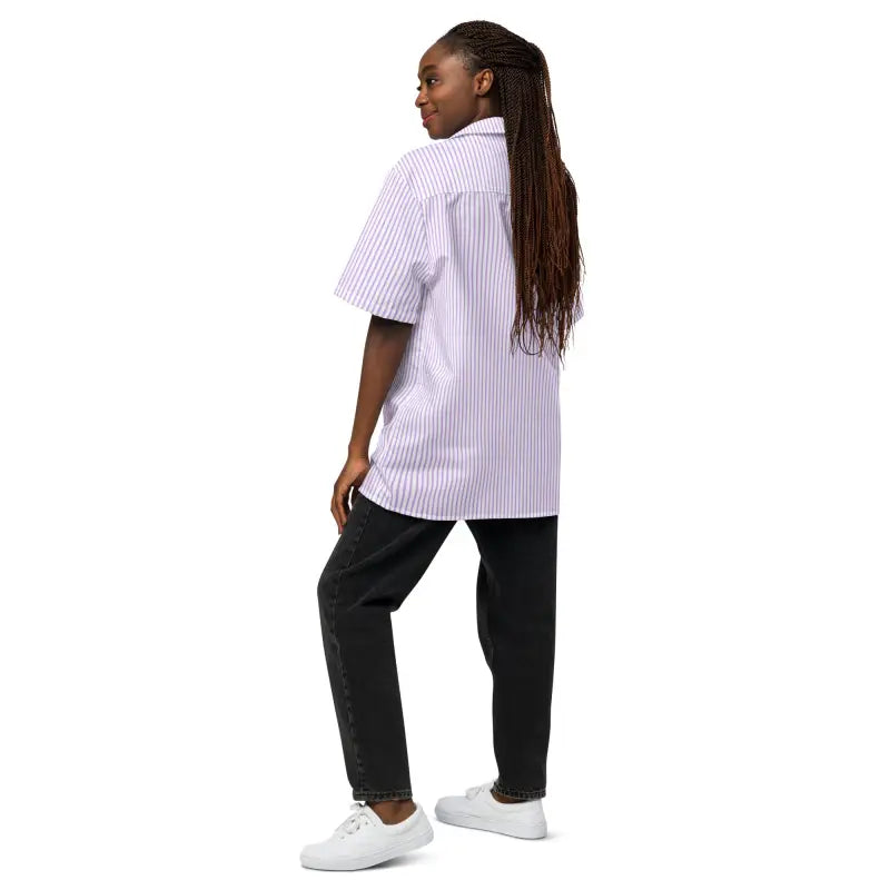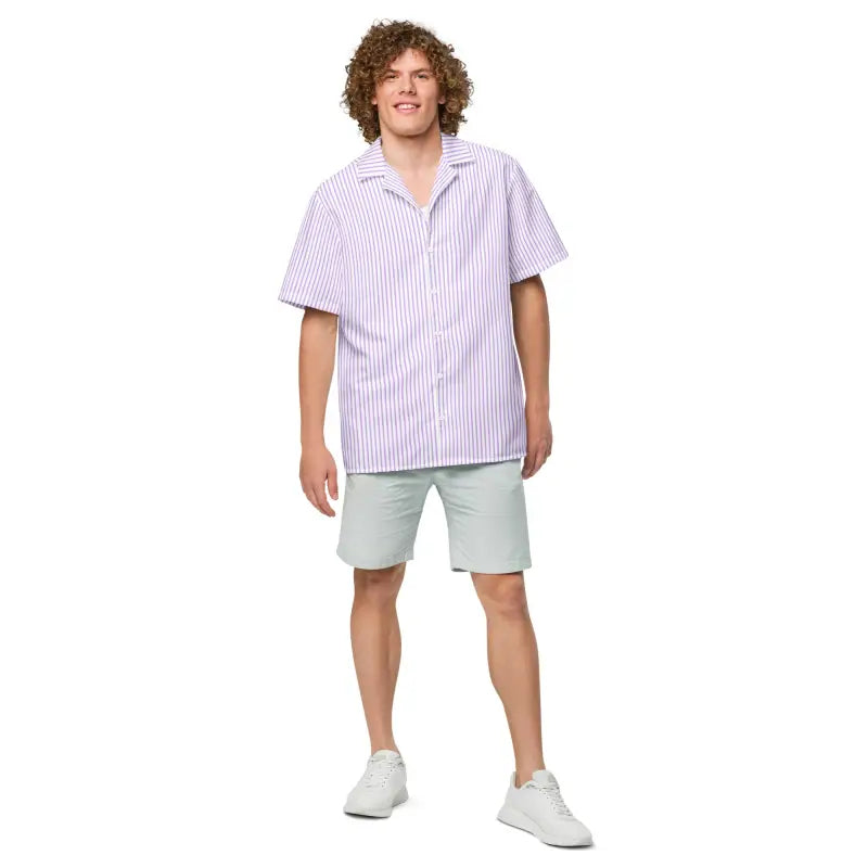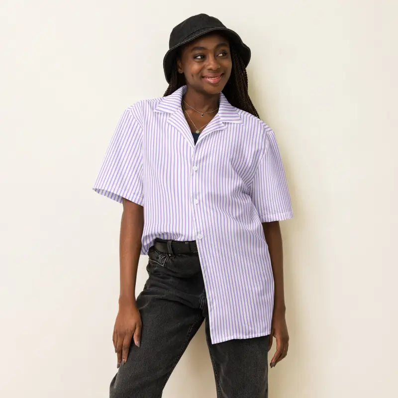 • Purple striped button shirt style that combines sporty vibes with everyday cool.