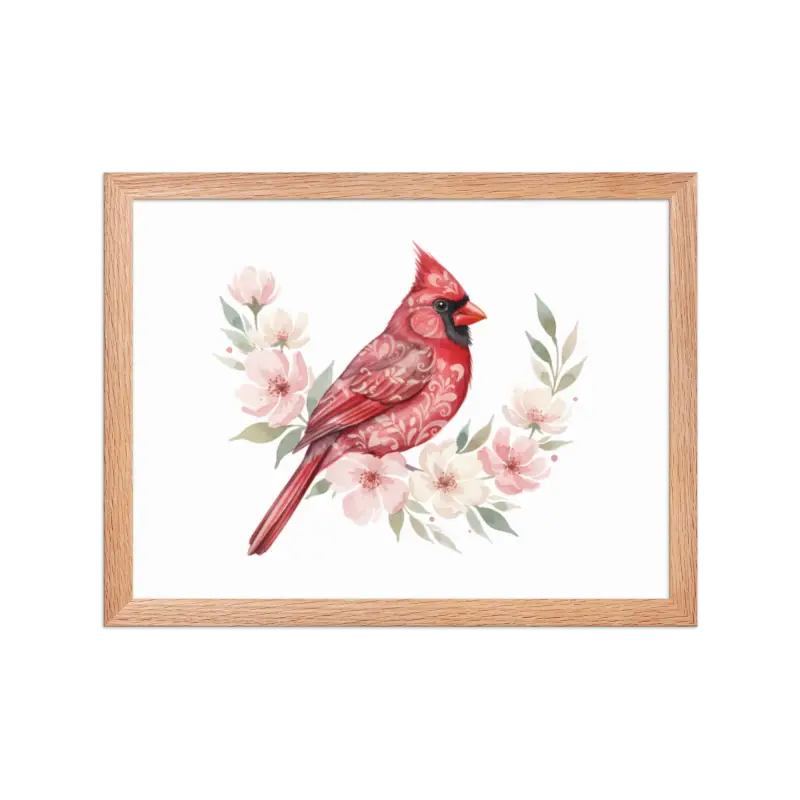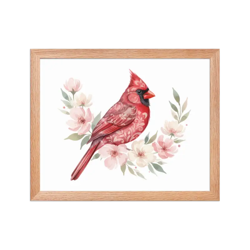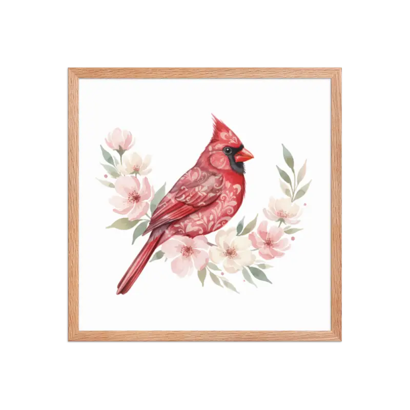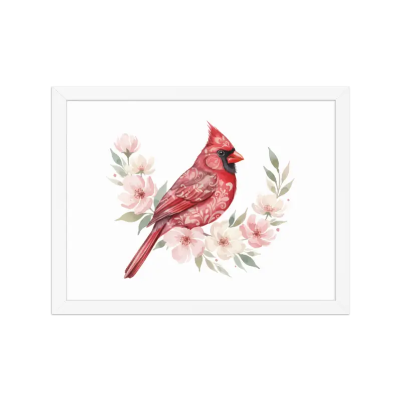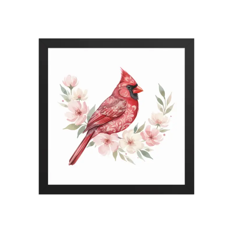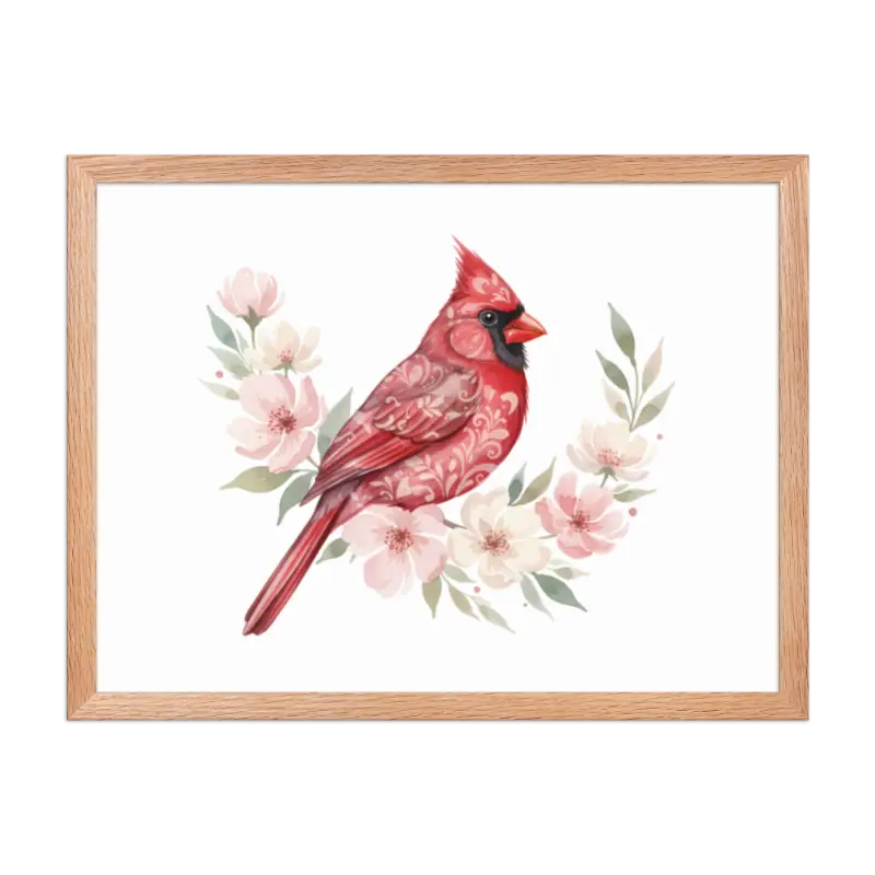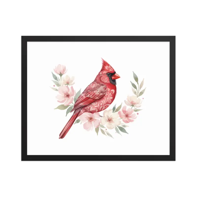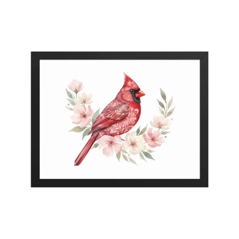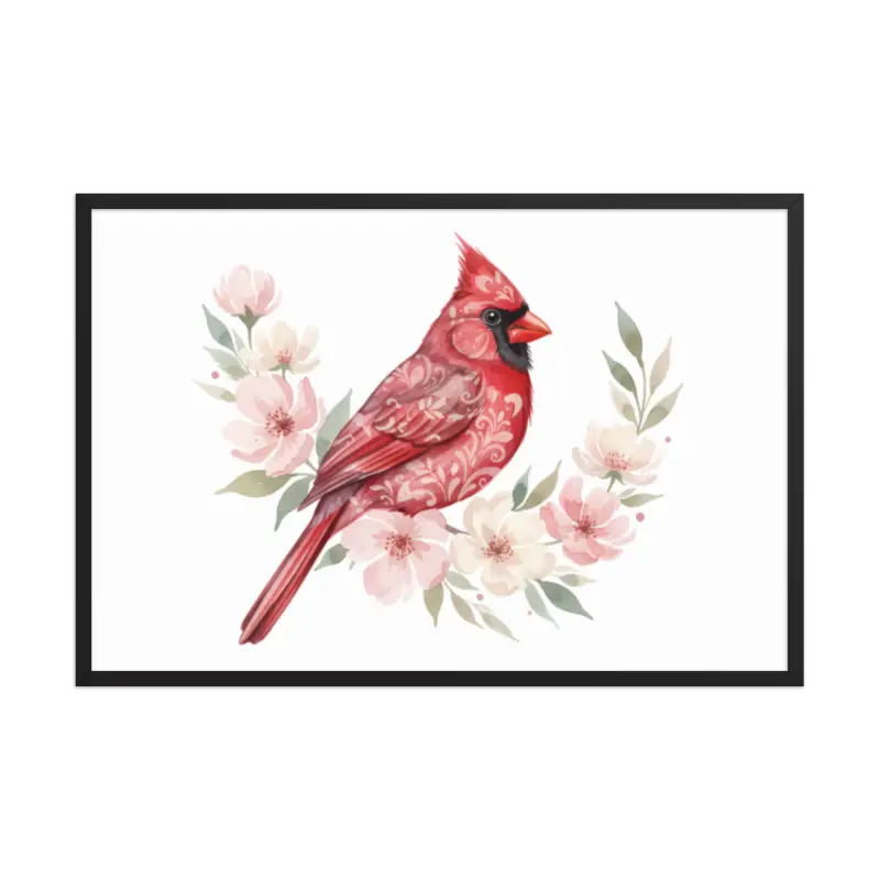 Feel the warmth of nature every time you glance at this stunning framed poster. The vivid red cardinal pops against its soft matte background, framed in sleek black wood from renewable forests that brings timeless charm to any space.