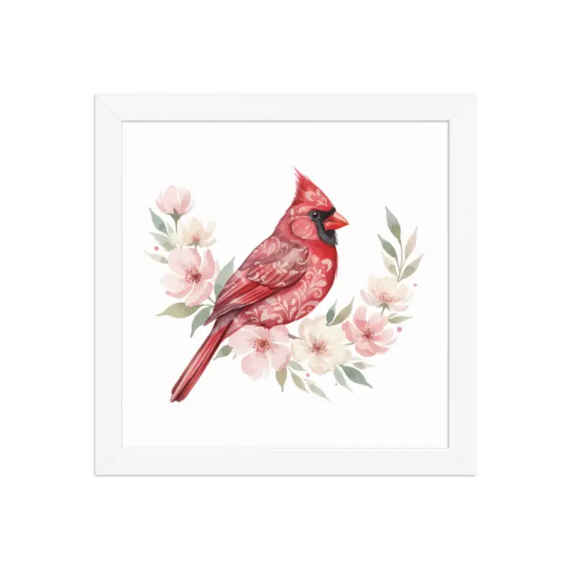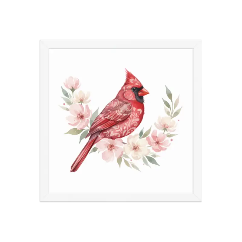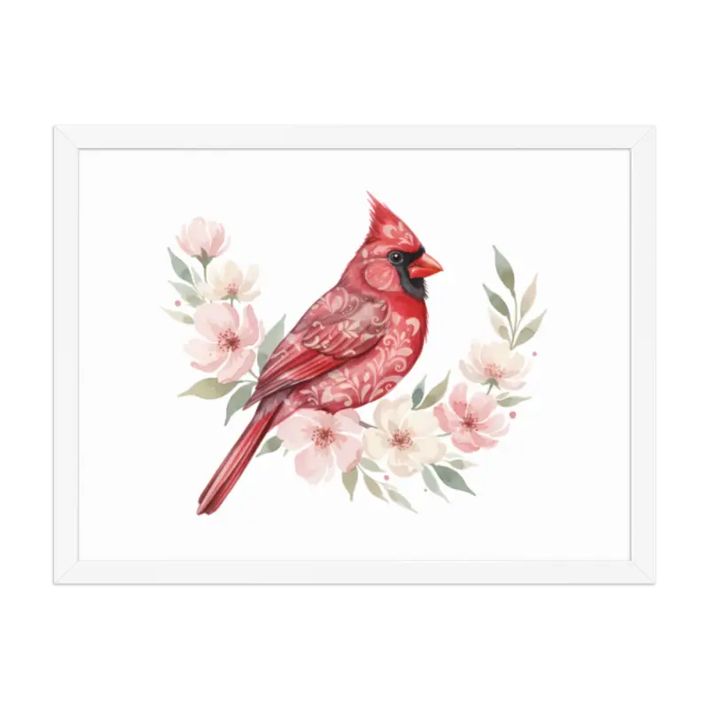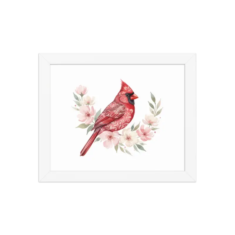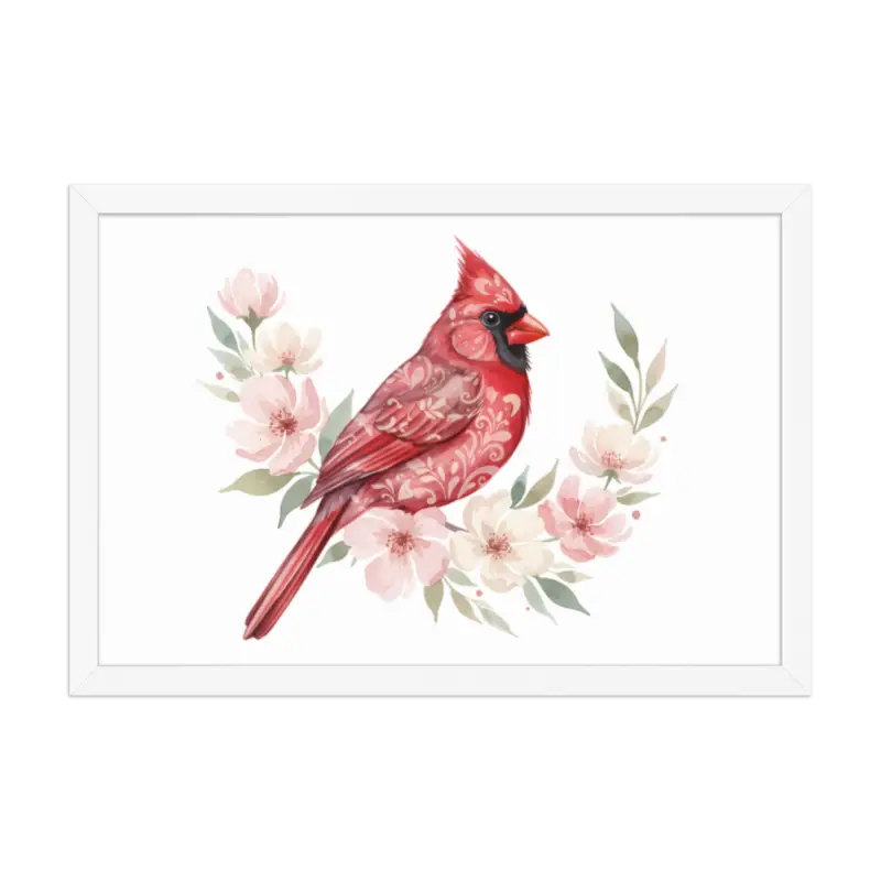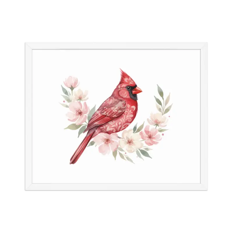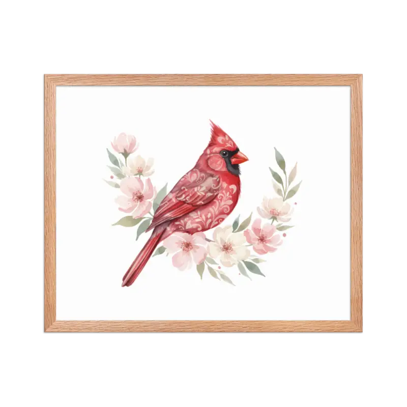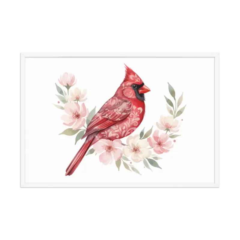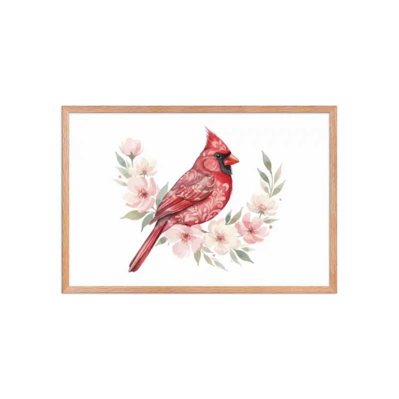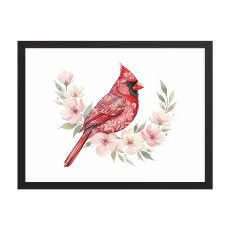 Feel the warmth of nature every time you glance at this stunning framed poster. The vivid red cardinal pops against its soft matte background, framed in sleek black wood from renewable forests that brings timeless charm to any space.