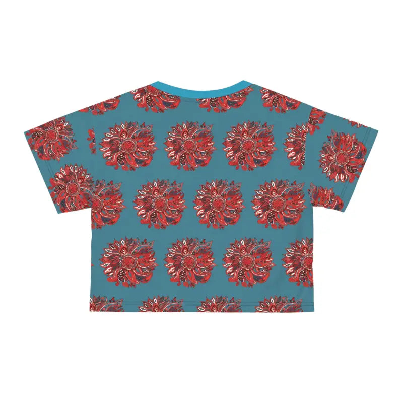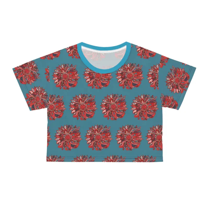 Unleash your inner fashion dynamo with the Rock Your Style: Silky Soft Red Pattern Crop Tee, guaranteed to amp up your wardrobe game to extraordinary levels. This isn't just another crop tee; it's your all-access pass to a world of comfort and flair wrapped together. Imagine draping yourself in a sleek piece made from 100% silky soft polyester that not only pampers your skin but also promises to keep you looking sharp and trendy everywhere you go. Let's talk about style: featuring an eye-catching red pattern against a breezy blue backdrop, this crop tee brings an effortless mix of classic charm and modern chic to your look.
