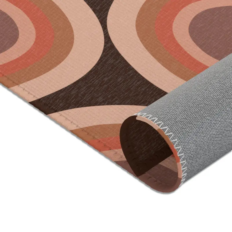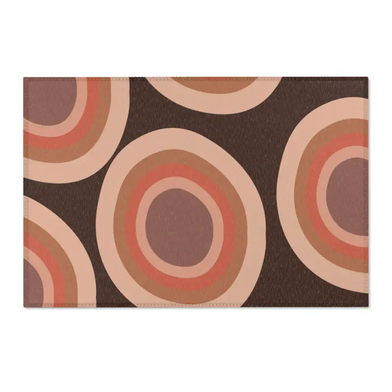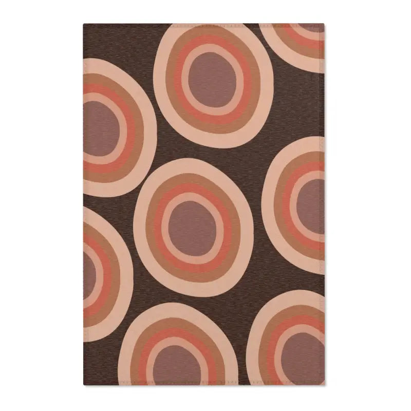 Design motif dances between classic mid-century circles and free-spirited bohemian swirls in a warm palette of terracotta, ochre, and teal