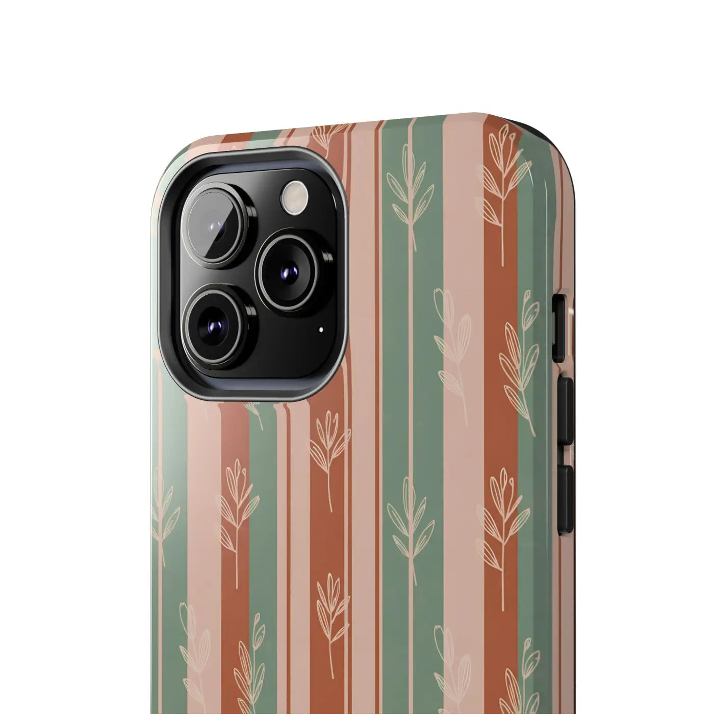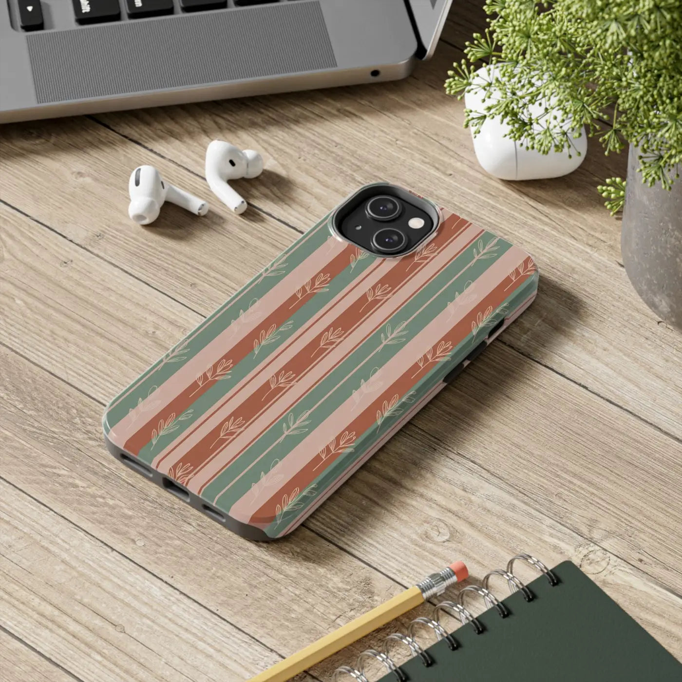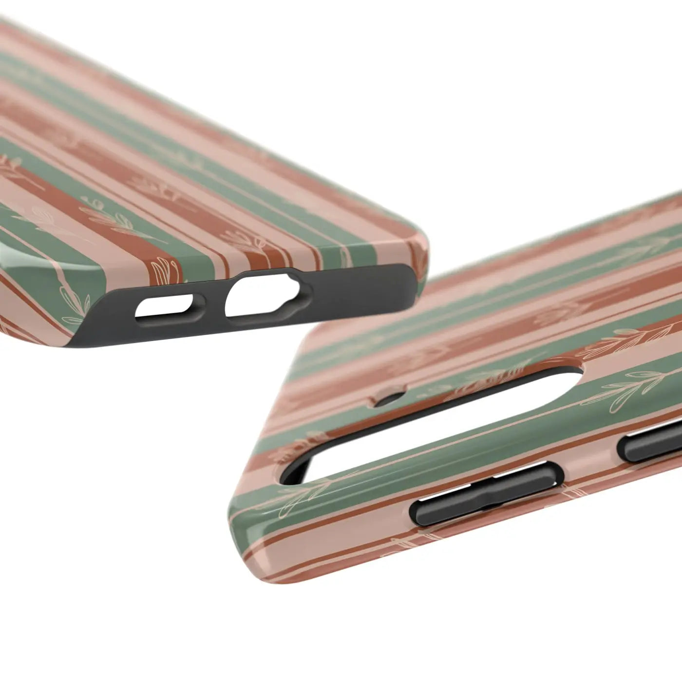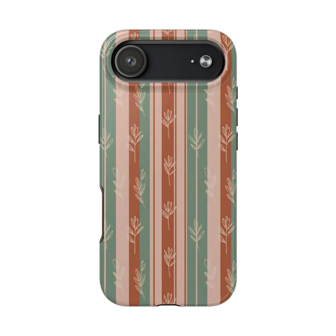 A slim, protective phone case that brings quiet, earthy style to your everyday carry. Warm terracotta, muted sage, and soft blush stripes form a gently repeating pattern of hand-drawn sprigs—subtle and organic against a glossy finish. The two-piece shell and flexible rubber liner work together to absorb shocks and shield edges, while a lay-flat bezel keeps the screen off surfaces. Lightweight yet rugged, this case lets you move through days that blend outdoor rhythms with city life, keeping your device safe without hiding your personal aesthetic.