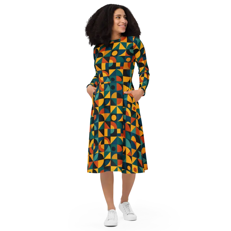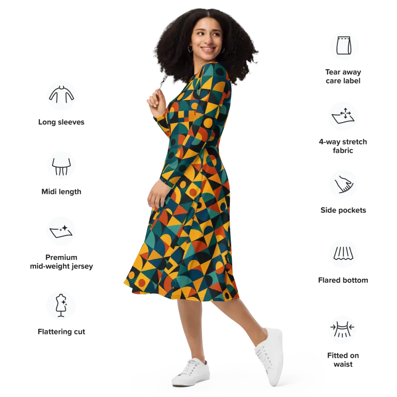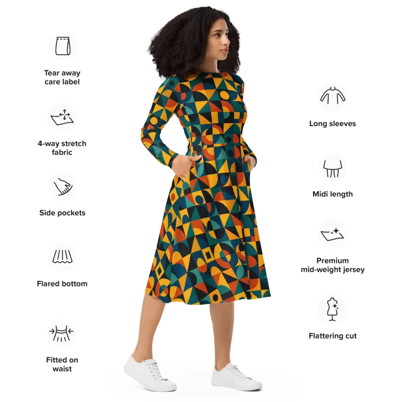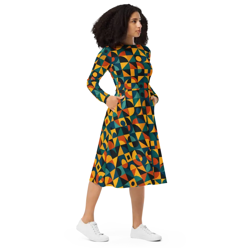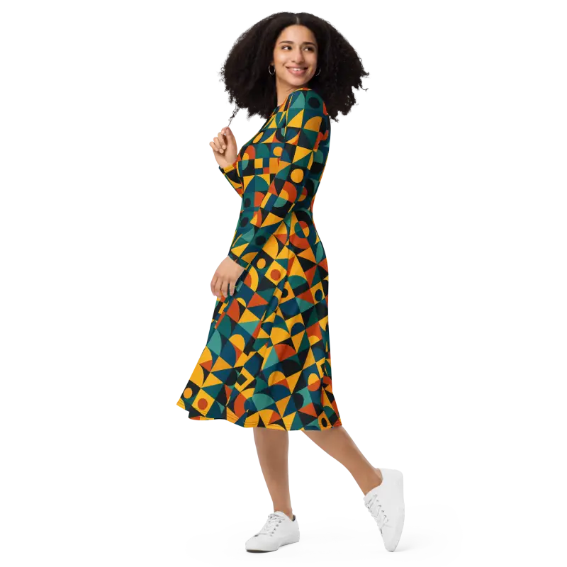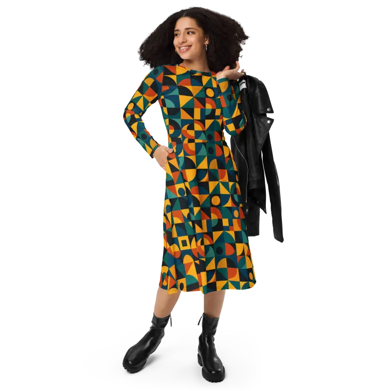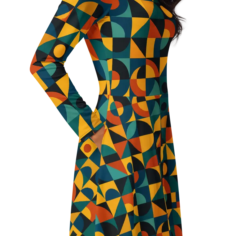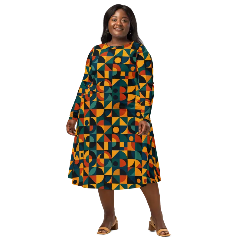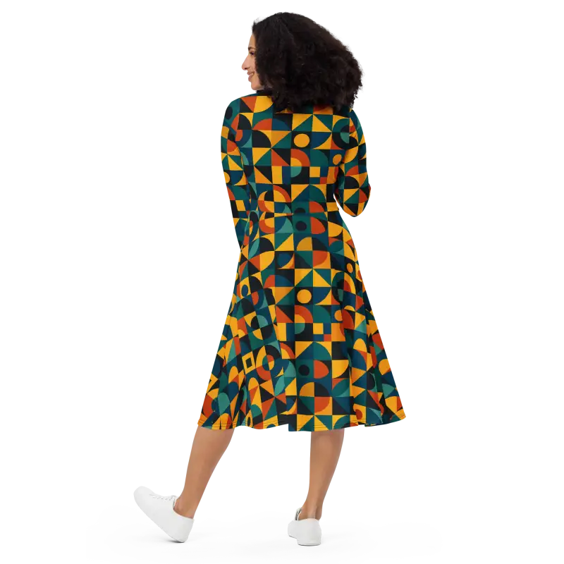 Vibrant jewel tones combine with bold shapes in a retro geometric pattern, creating an eye-catching all-over print that plays with light and movement. The fitted waist transitions into a flared skirt that accentuates curves, while long sleeves add a touch of elegance and extra coziness.