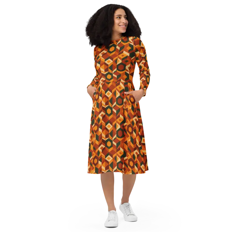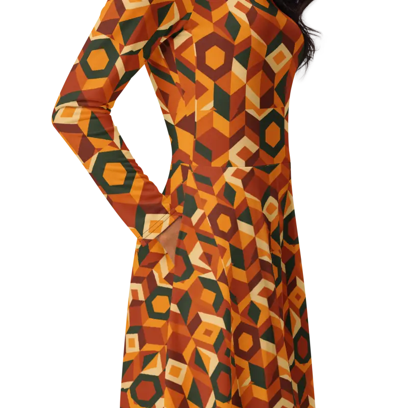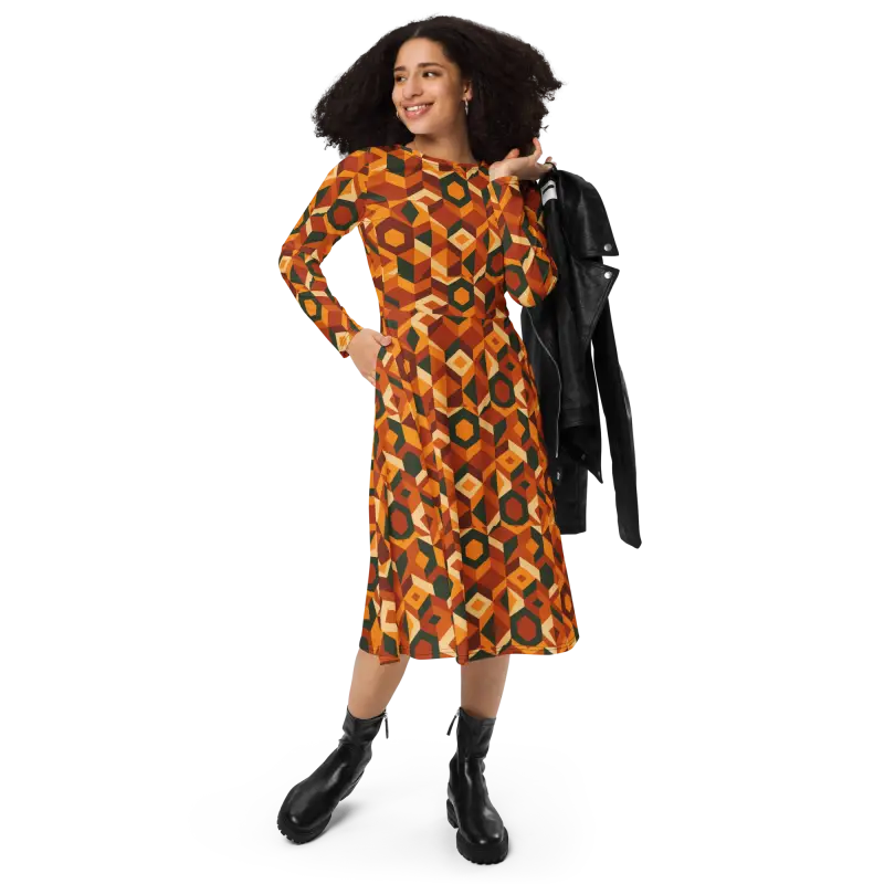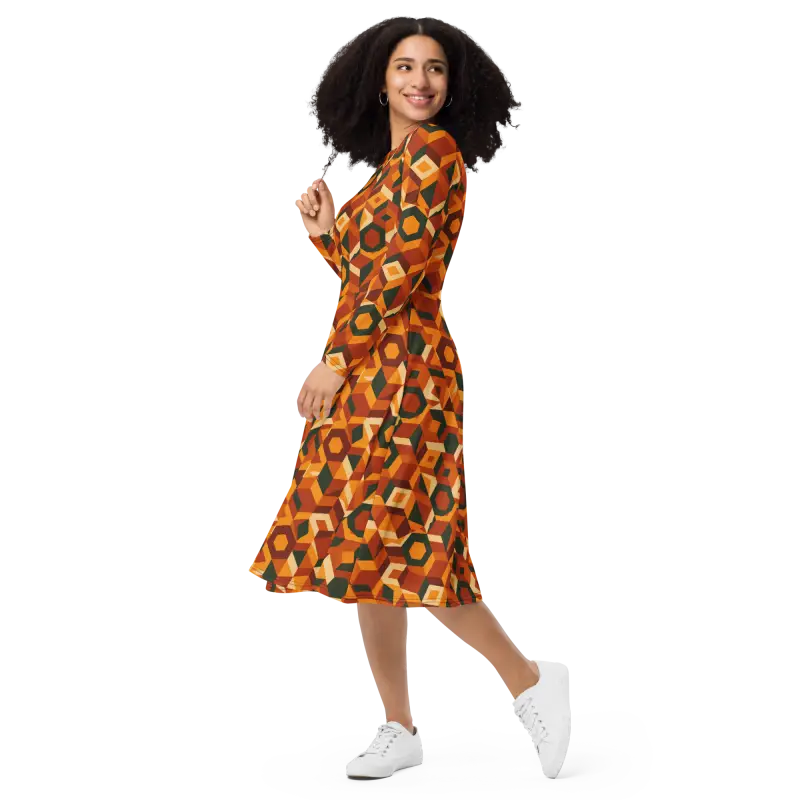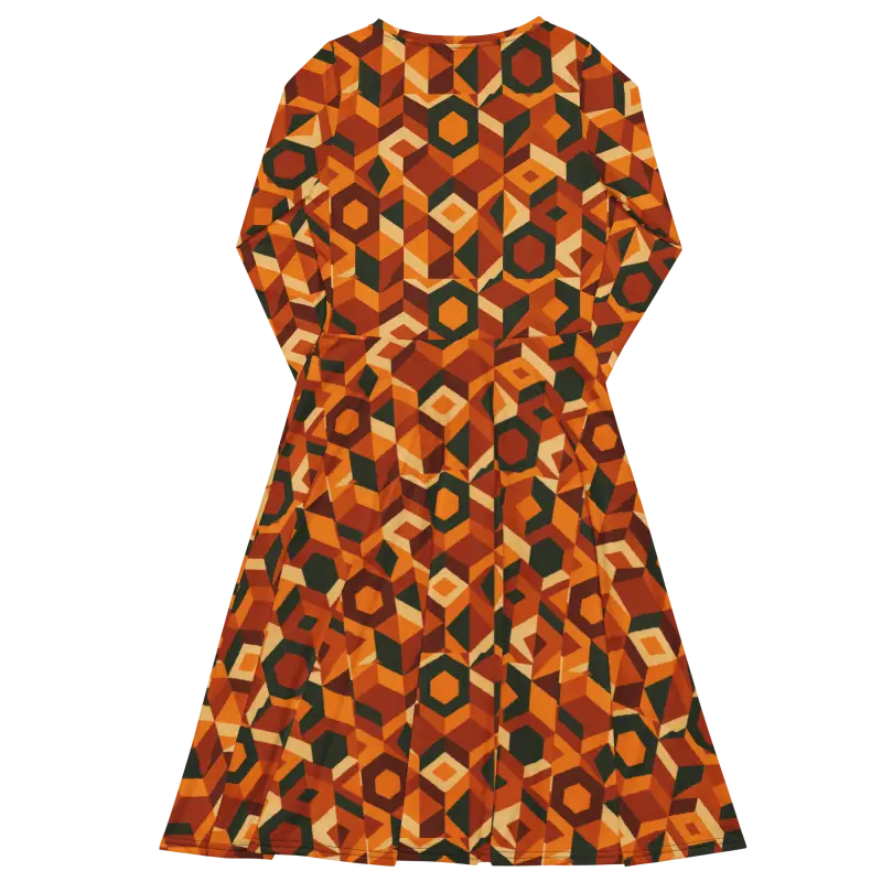 Splashing retro orange geometric vibes across a dreamy long sleeve midi silhouette, this dress is all about modern femininity and playful flair. Imagine the sun catching those angular shapes as you turn heads at brunch or breeze through weekend plans.