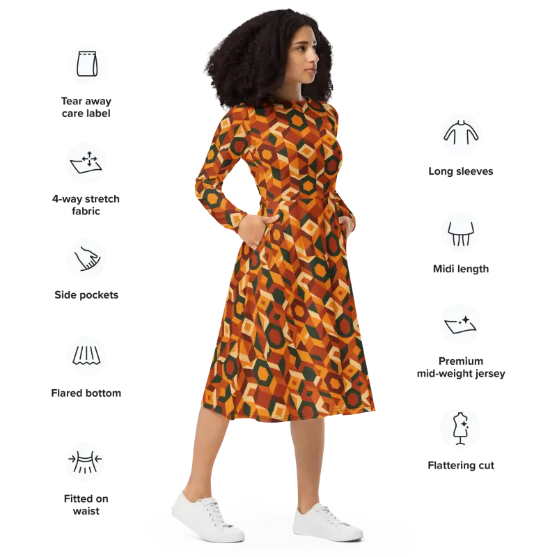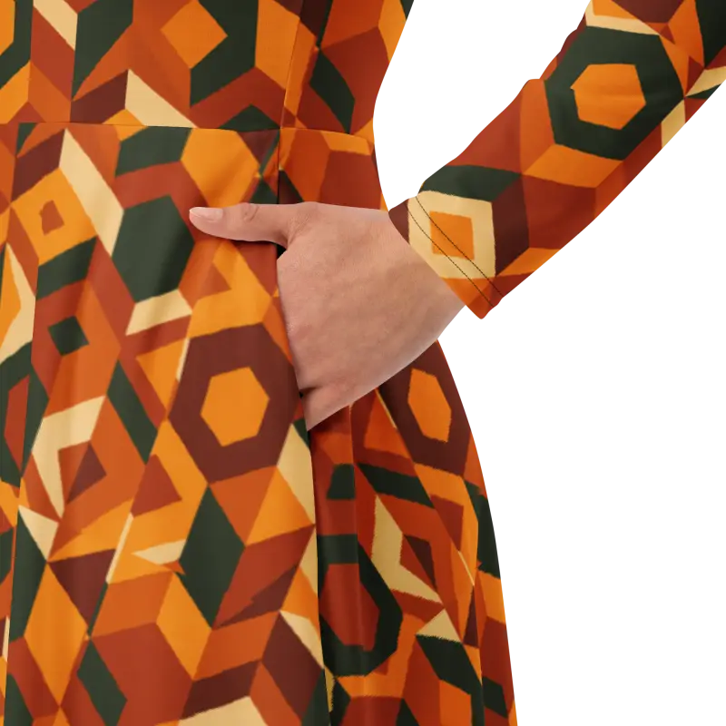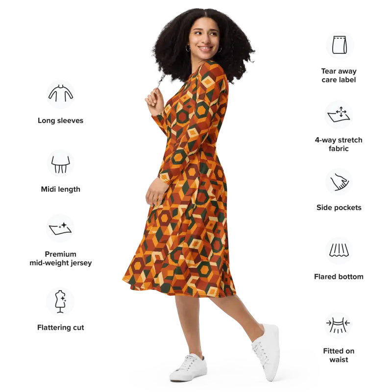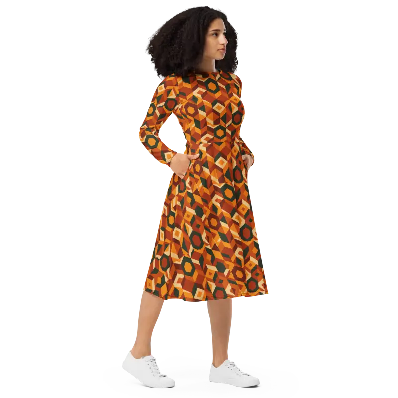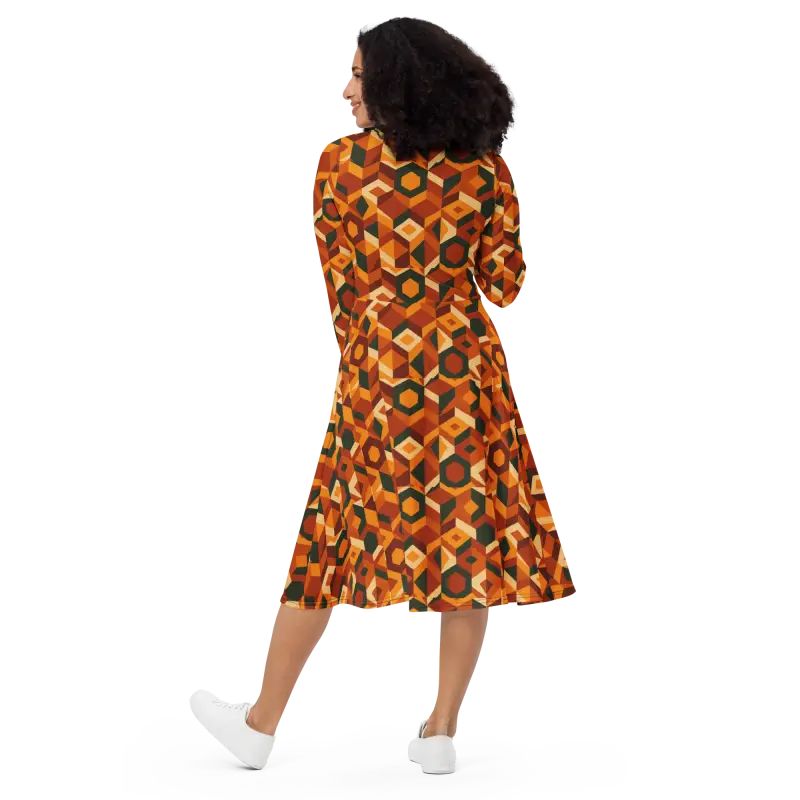 Splashing retro orange geometric vibes across a dreamy long sleeve midi silhouette, this dress is all about modern femininity and playful flair. Imagine the sun catching those angular shapes as you turn heads at brunch or breeze through weekend plans.