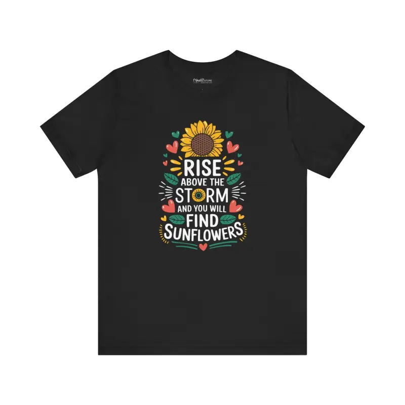 Rise above the storm and you will find sunflowers, Unisex Jersey Short Sleeve Tee. This timeless unisex jersey short sleeve t-shirt offers a familiar and cherished feel. Its gentle cotton and premium print create an enduring affection among wearers. These shirts feature ribbed knit collars for enhanced structure and taped shoulders for lasting fit. The dual side seams further preserve the garment's form.