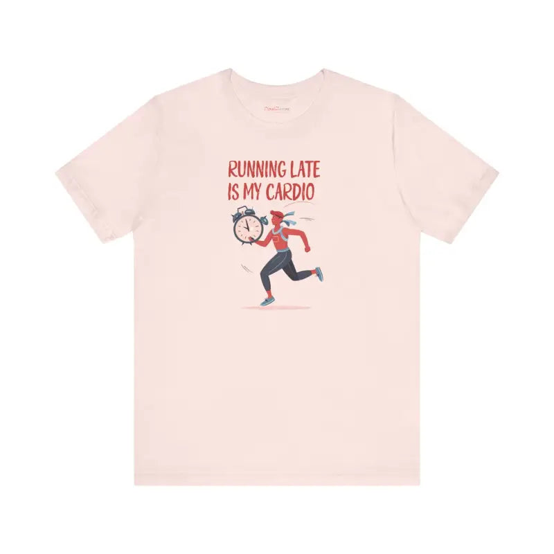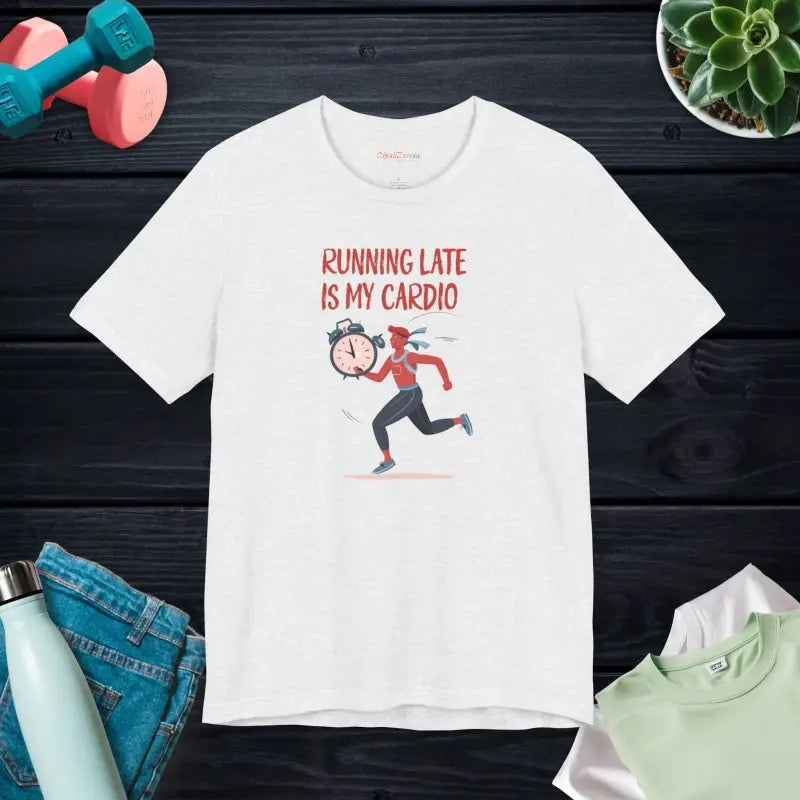 Running late is my Cardio Unisex Jersey Short Sleeve Tee. This classic unisex jersey short sleeve tee fits like a well-loved favorite. Soft cotton and quality print make users fall in love with it over and over again. These t-shirts have-ribbed knit collars to bolster shaping. The shoulders are tapered for a better fit over time. Dual side seams hold the garment's shape for longer.