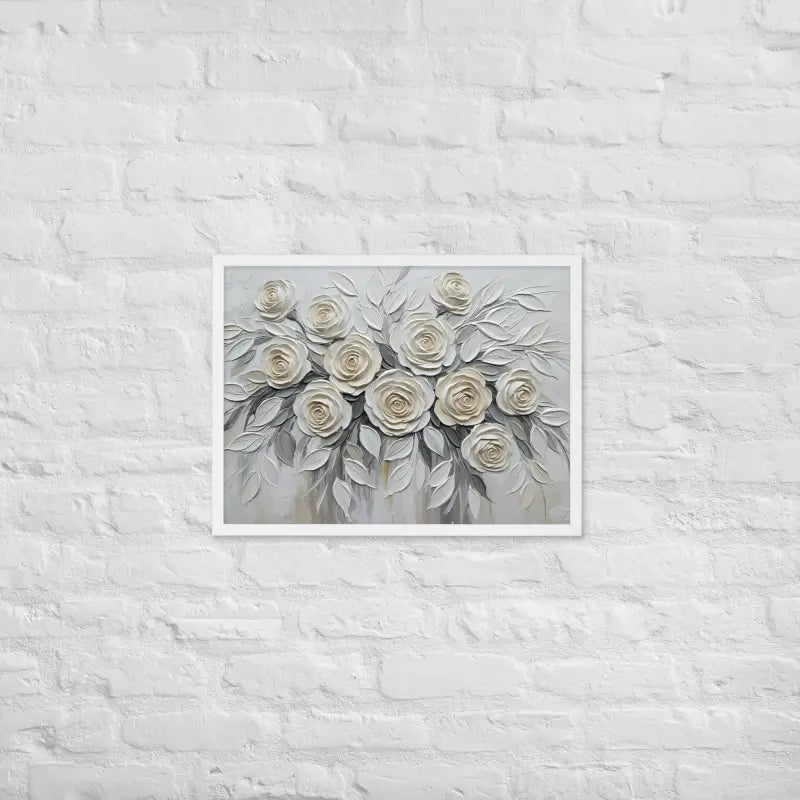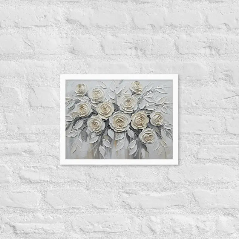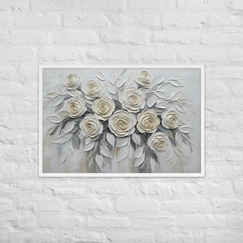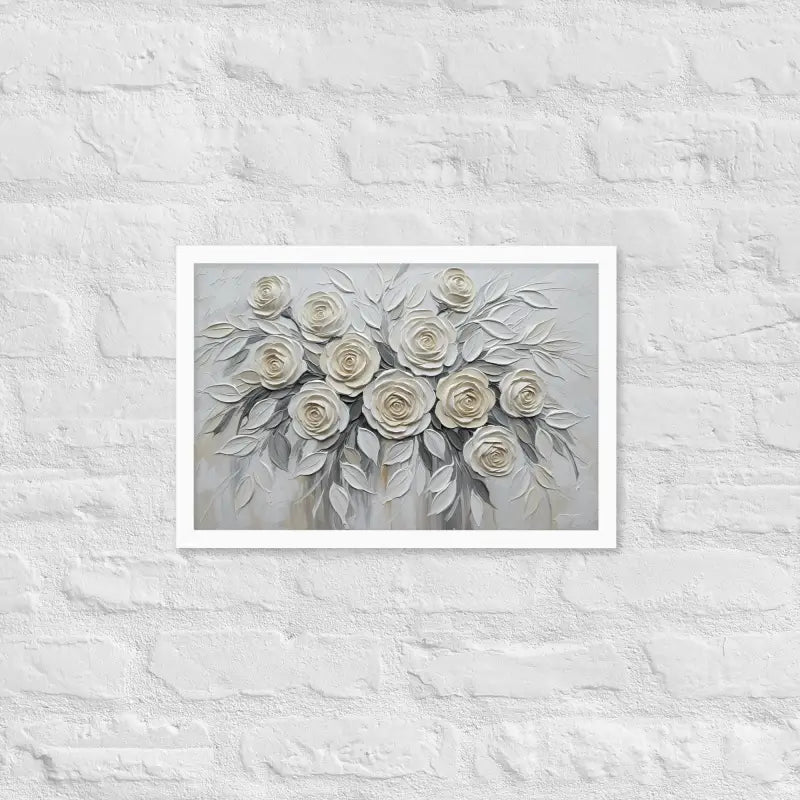 Bring timeless charm to your space with this sculptured white rose framed poster that captures the soft glow and delicate beauty of a white rose bouquet in full bloom. Its matte finish and rich texture create a calming, elegant vibe that instantly elevates any room.