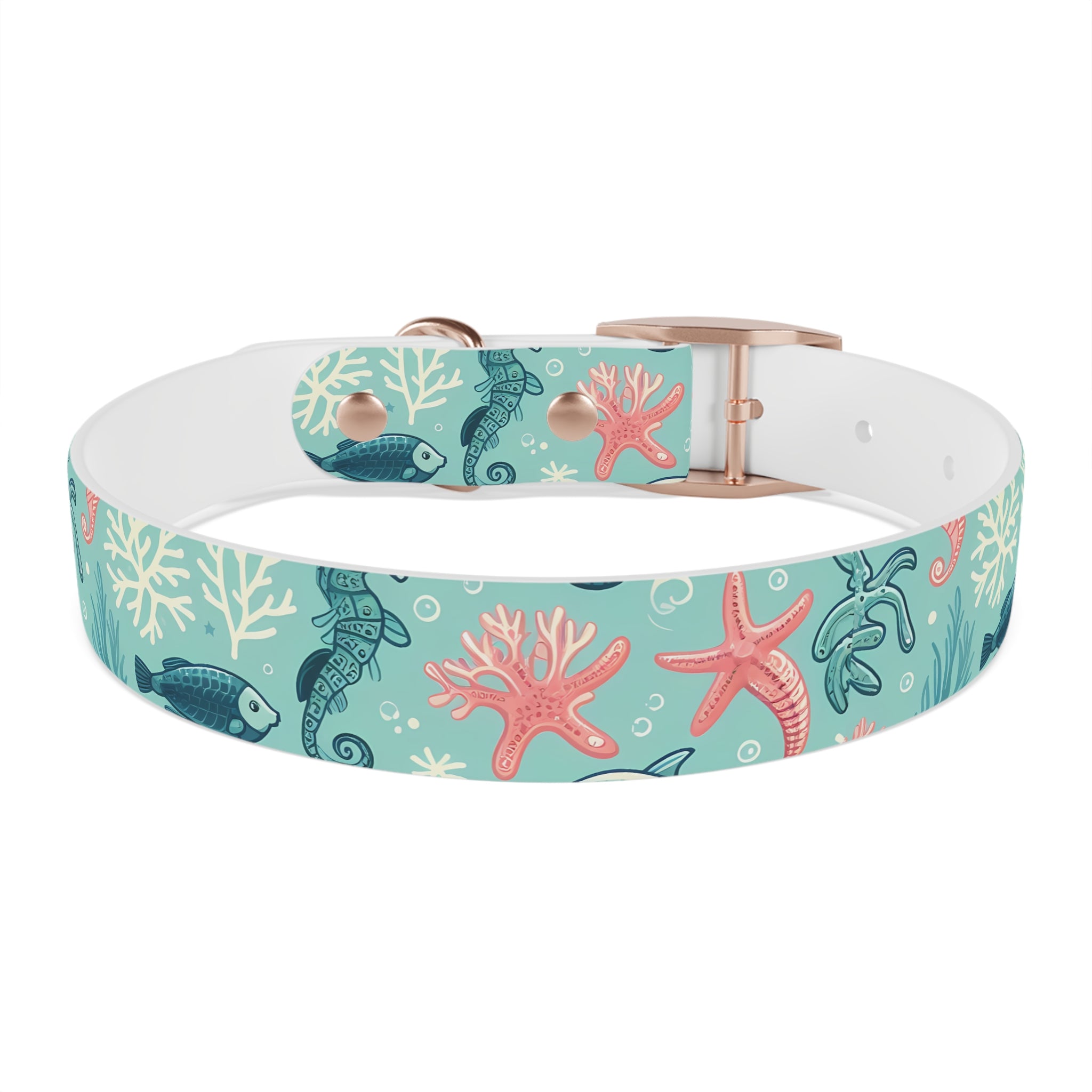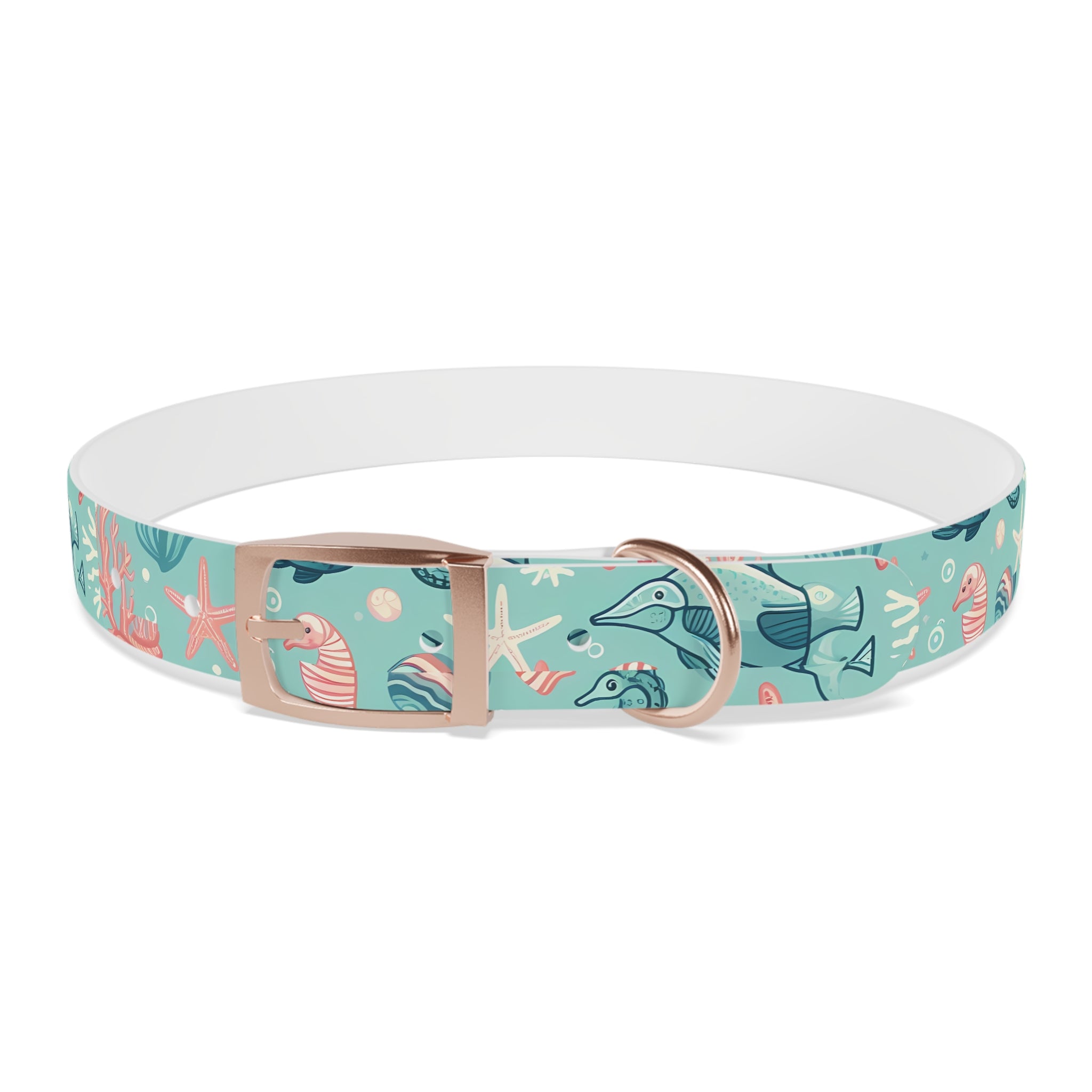 Saltwater afternoons and sandy paws—this collar carries a calm, ocean-breezy spirit wherever your dog wanders. Soft teal waves, playful seahorses and little fish drift across a waterproof TPU band that bends with each eager tug and shake. The hypoallergenic, odor-resistant material stays fresh after muddy walks and beach romps, and the anodized buckle options add a low-key, durable accent that won’t rust from sea spray. It’s lightweight enough for everyday wear, tough enough for off-leash explorations, and easy to wipe clean after a day chasing tides.