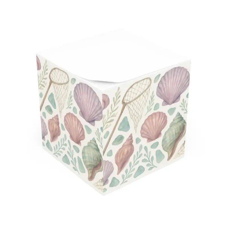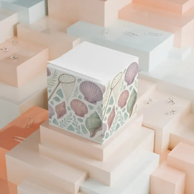 Soft seashell motifs swirl across each page in soothing hues of sandy beige, aqua blue, and pearly white. The compact cube is a tactile delight with smooth edges and thick sheets that feel like a mini seaside escape on your desk or nightstand.