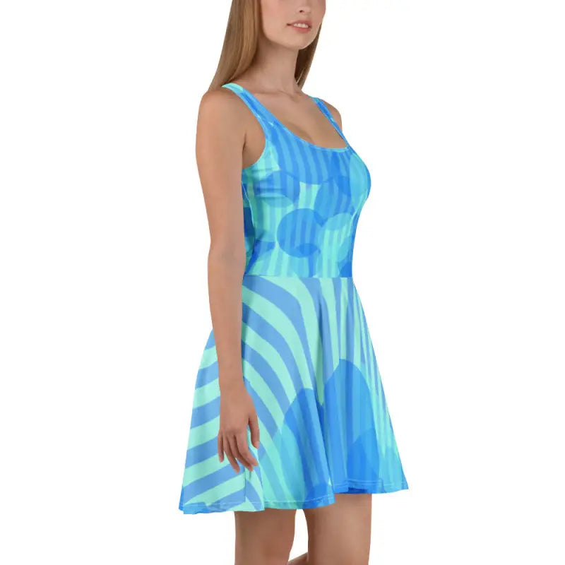 The Blue Wavy Stripes Skater Dress is more than just a piece of clothing – it's a statement. As you twirl and spin, the wavy stripes create an illusion of movement, making you the life of the party. Whether you're heading to a summer barbecue or a night out with friends, this dress has got you covered.