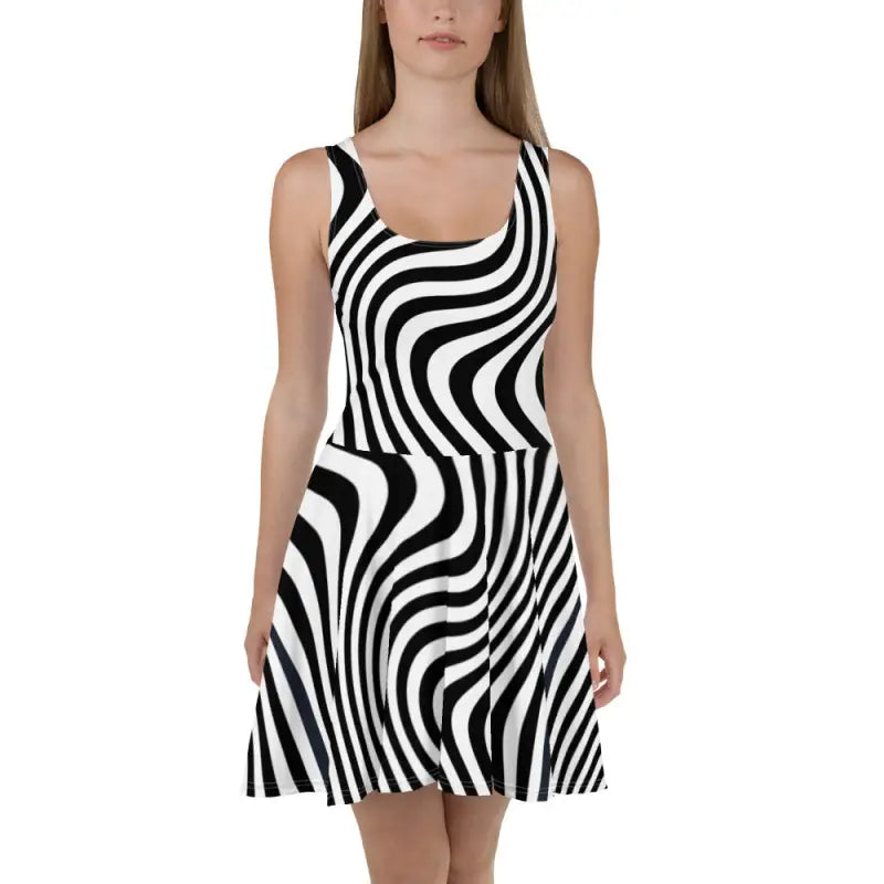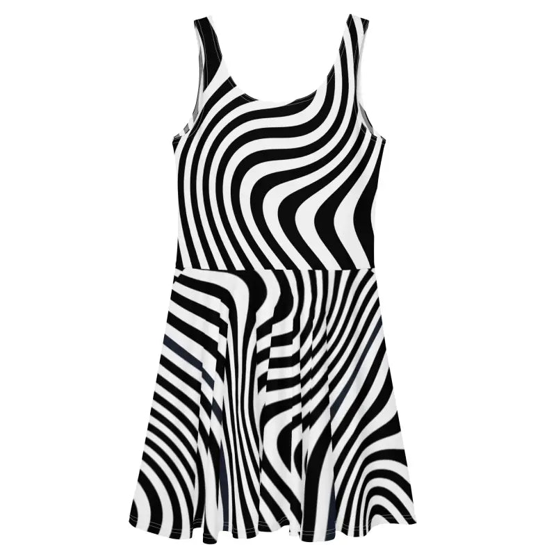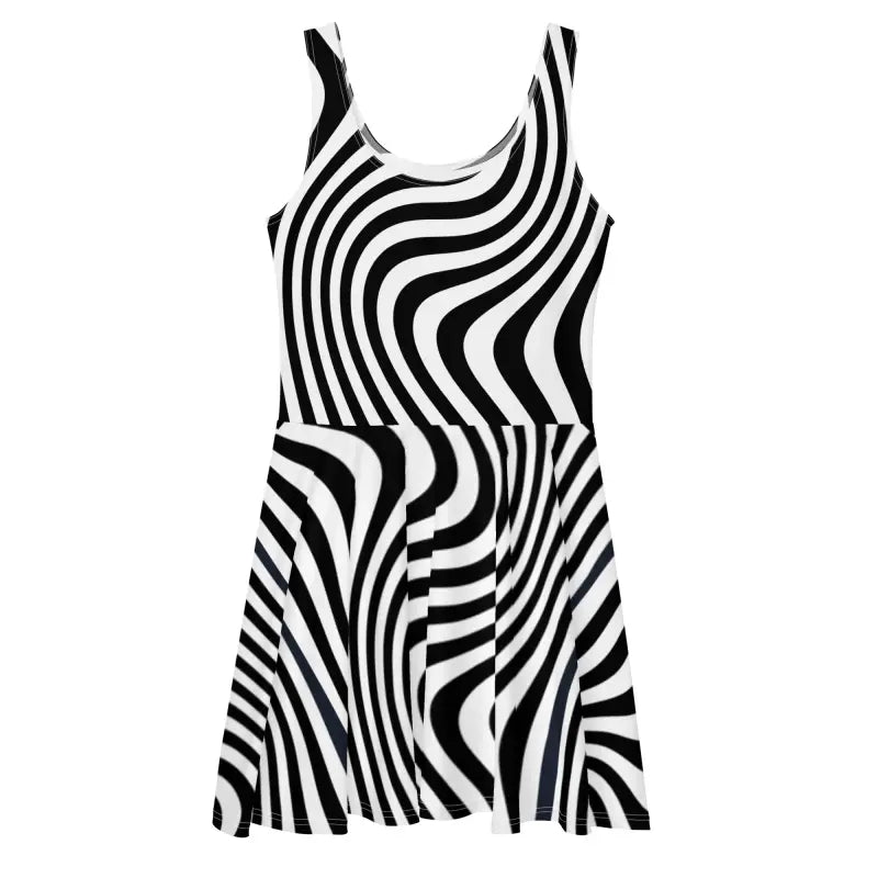 Let's dive into why this skater dress will be your latest obsession. First off, it boasts bold white wavy stripes set against a stunning backdrop, adding a trendy twist to the classic pattern. The design is both hypnotic and artistic, making it an inevitable conversation starter wherever you go. Turn heads and elicit compliments with its unique style that sets you apart from the crowd.
