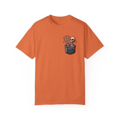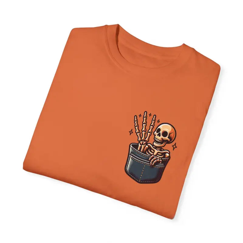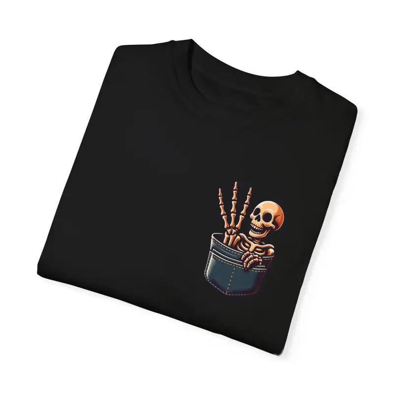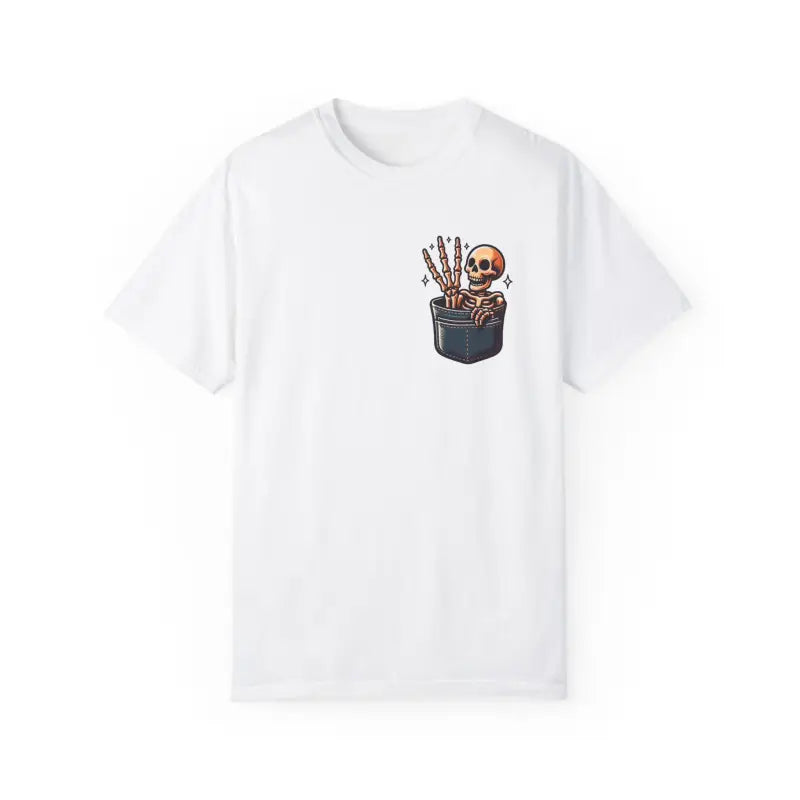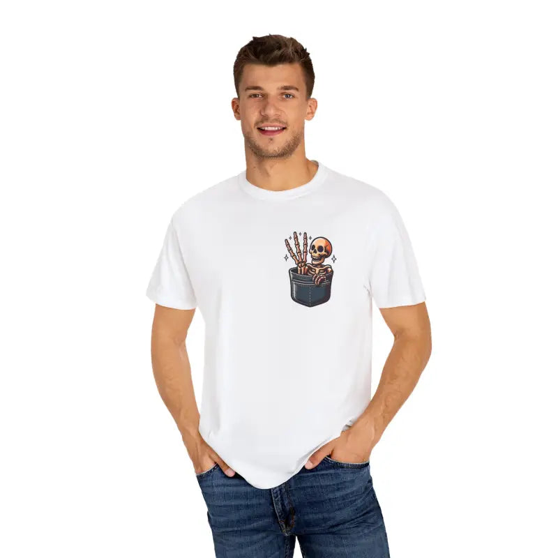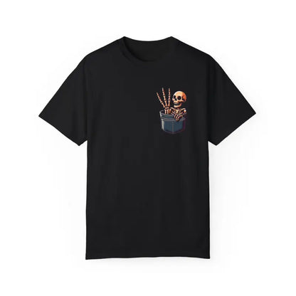 Add a dash of personality to your style with the cotton tee that perfectly blends comfort, humor, and standout design. Choose the Skeleton in a Pocket with Three Fingers for a wardrobe staple that keeps you looking cool and feeling great, season after season. Make your next funny t-shirt one everyone remembers—grab yours now before it disappears into thin air!