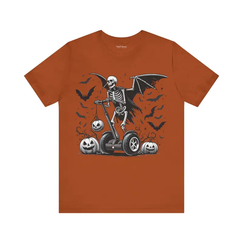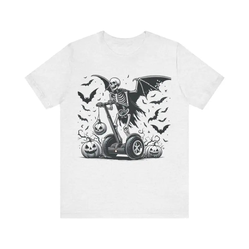 Get ready to turn heads and make a statement with this one-of-a-kind unisex jersey short sleeve t-shirt, featuring an eye-catching skeleton soaring on a Segway with majestic wings! Perfect for Halloween or anytime you want to add a spooky twist to your outfit, this tee blends creativity with comfort. Made from the softest 100% Airlume combed and ringspun cotton, you'll experience an unmatched snugness that feels like a second skin. Feel confident as the premium print design lasts wear after wear, transforming every casual outing into an opportunity for self-expression.
