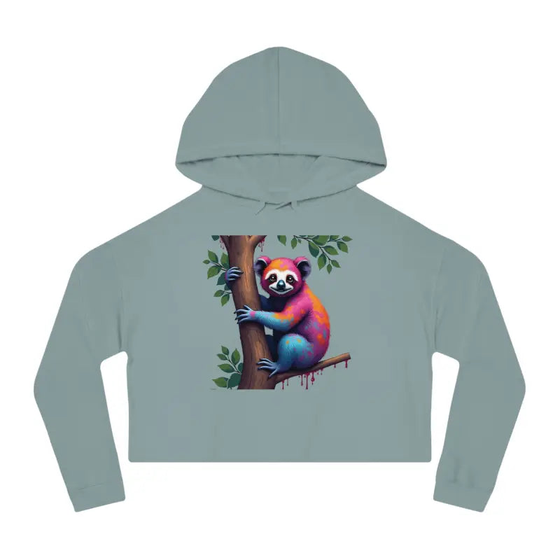 Misty greens mingle with soft grays across a sloth cropped hooded design, the abstract tropical leaves flowing around a laid-back creature. Whimsical curves and botanical shapes bring instant chic sloth vibes to your wardrobe.