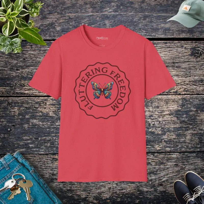 Fluttering Freedom. Butterfly Unisex Softstyle T-Shirt. The unisex soft-style t-shirt puts a new spin on casual comfort. Made from very soft materials, this tee is 100% cotton for solid colors. The shoulders have twill tape for improved durability. There are no side seams. The collar is made with ribbed knitting to prevent curling damage.