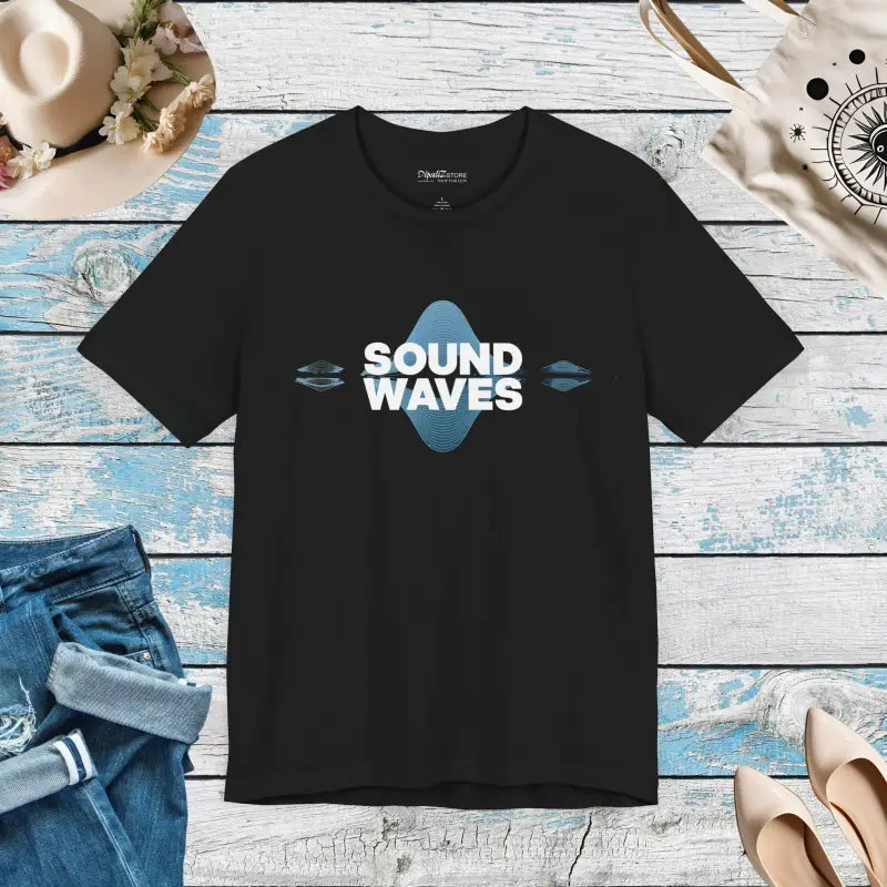 Sound Waves, Unisex Jersey Short Sleeve Tee. This timeless unisex jersey short sleeve t-shirt offers a familiar and cherished feel. Its gentle cotton and premium print create an enduring affection among wearers. These shirts feature ribbed knit collars for enhanced structure and taped shoulders for lasting fit. The dual side seams further preserve the garment's form.