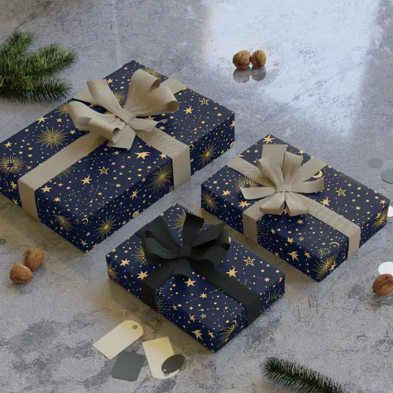 The deep blue background sets a luxe stage for soft gold suns and delicate twinkling stars. The pattern feels both elegant and whimsical, evoking cozy holiday gatherings under a star-studded vault. With its satin surface, every fold, ribbon, and crease catches the light just right, giving your presents a refined glow without overwhelming flashiness.
