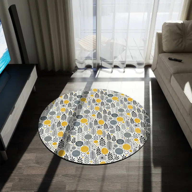 Discover the ultimate way to transform your living space with this sensational round rug designed to instantly uplift your decor. This stylish floral grey round rug is not only a showstopper in design but also a functional masterpiece crafted to bring comfort, style, and durability to your living room, bedroom, or nursery. With its vibrant floral pattern highlighted by lively yellow accents, this yellow round rug sets the perfect mood for any space while adding a touch of modern elegance.