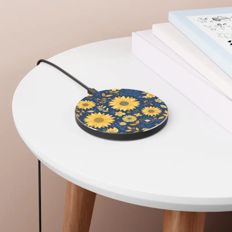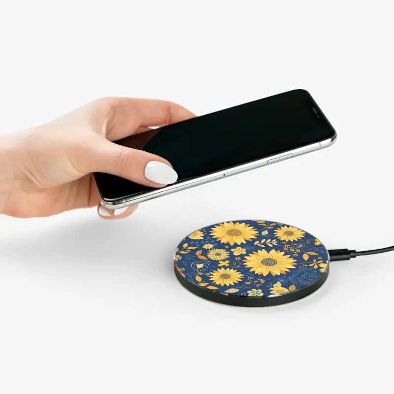 Picture deep navy skies kissed by golden sunflower petals dancing across a sleek, glossy surface. The vibrant blue and yellow palette pops against any backdrop, turning a simple phone qi pad into a mini art piece that sparks smiles every time you set your device down. The slim aluminum body feels premium in your hands while the non-slip base keeps everything secure during those hurried morning rushes.