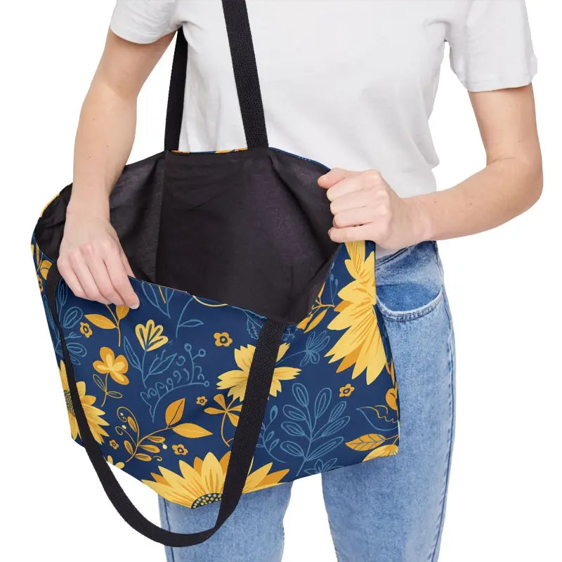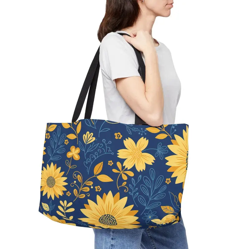 Get ready to turn heads with this stunning sunflower weekender tote that transforms every outing into a style statement! Vibrant golden sunflowers burst across a sophisticated navy canvas, creating the perfect blend of cheerful energy and elegant restraint.