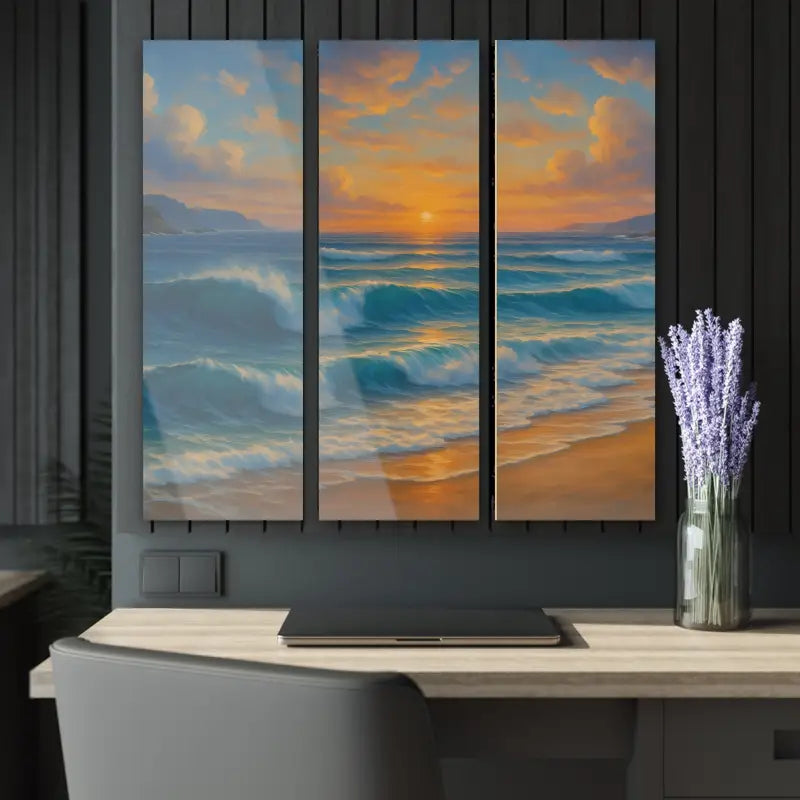 Looking for a splash of coastal magic? Transform your space with premium sunset beach acrylic triptych wall art that floods every room with vibrant ocean hues and a soothing coastal feel.