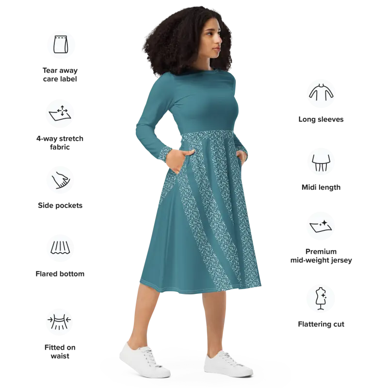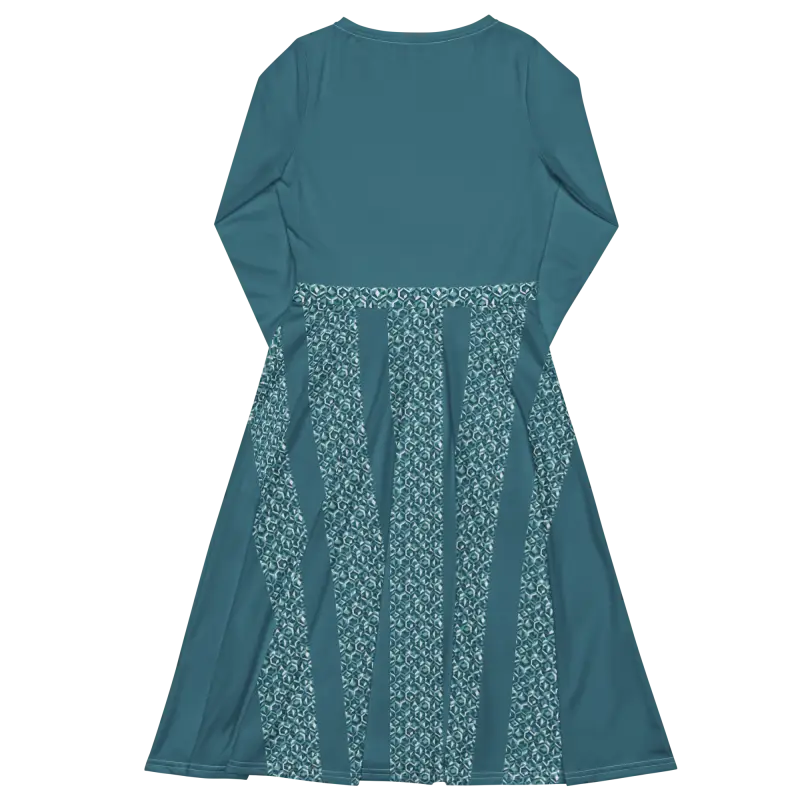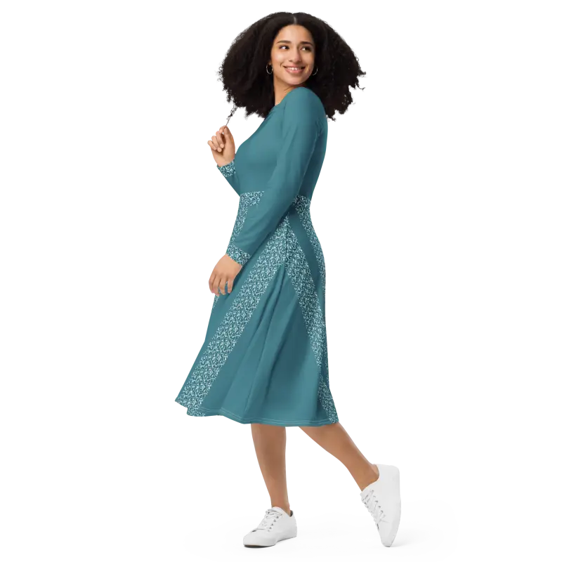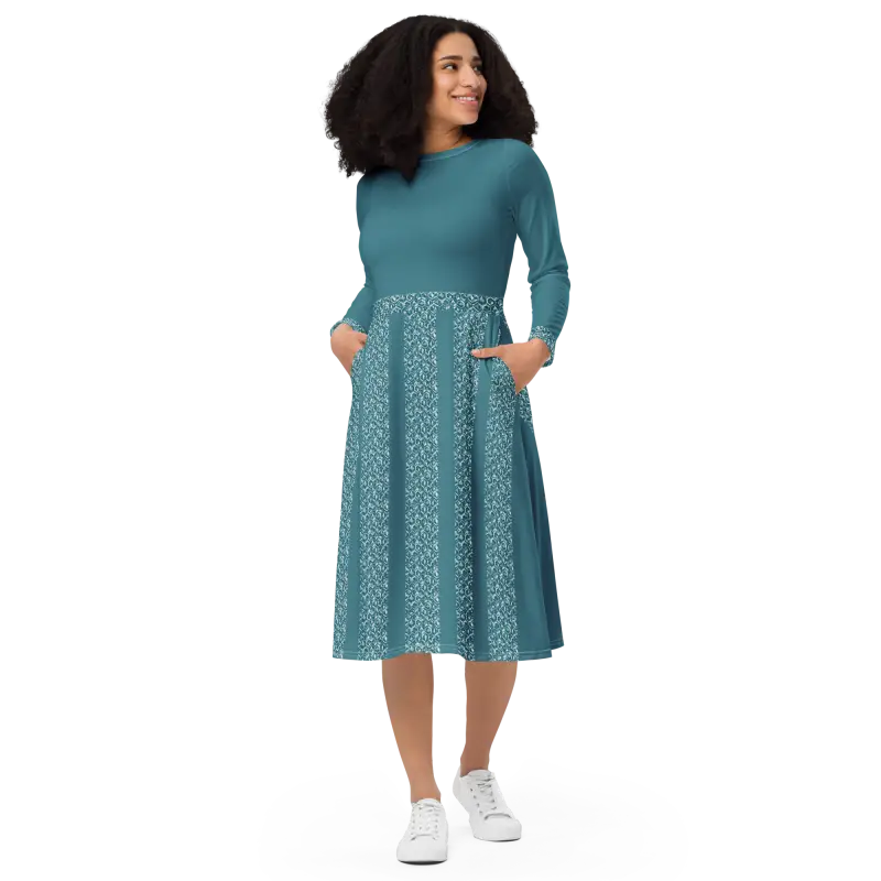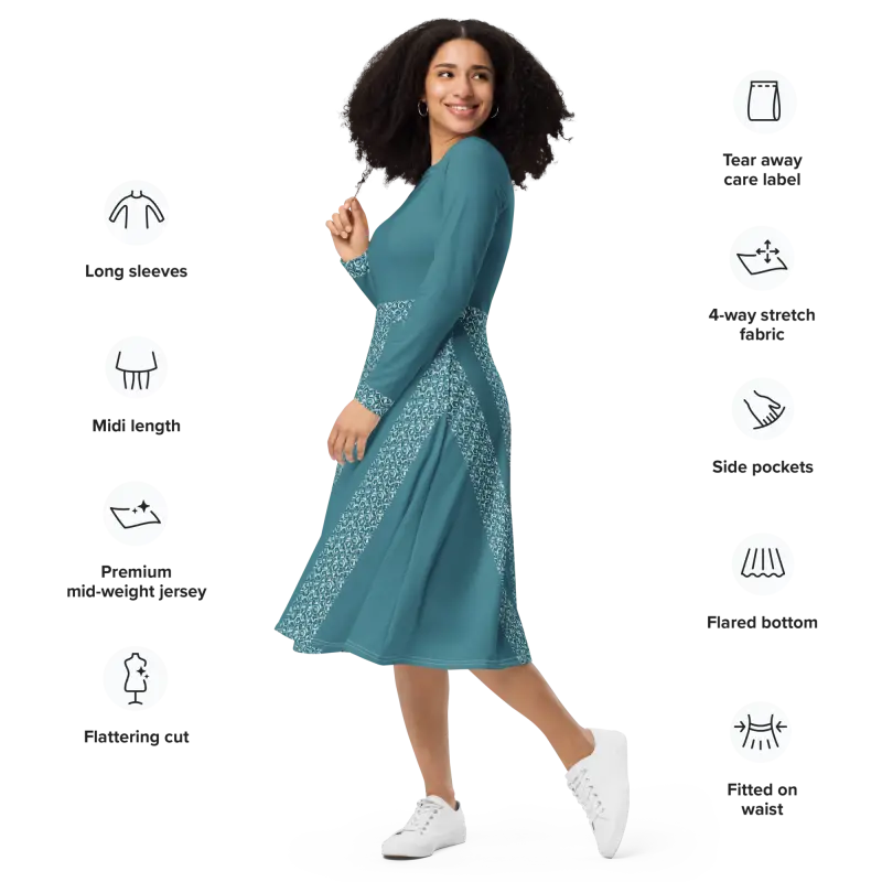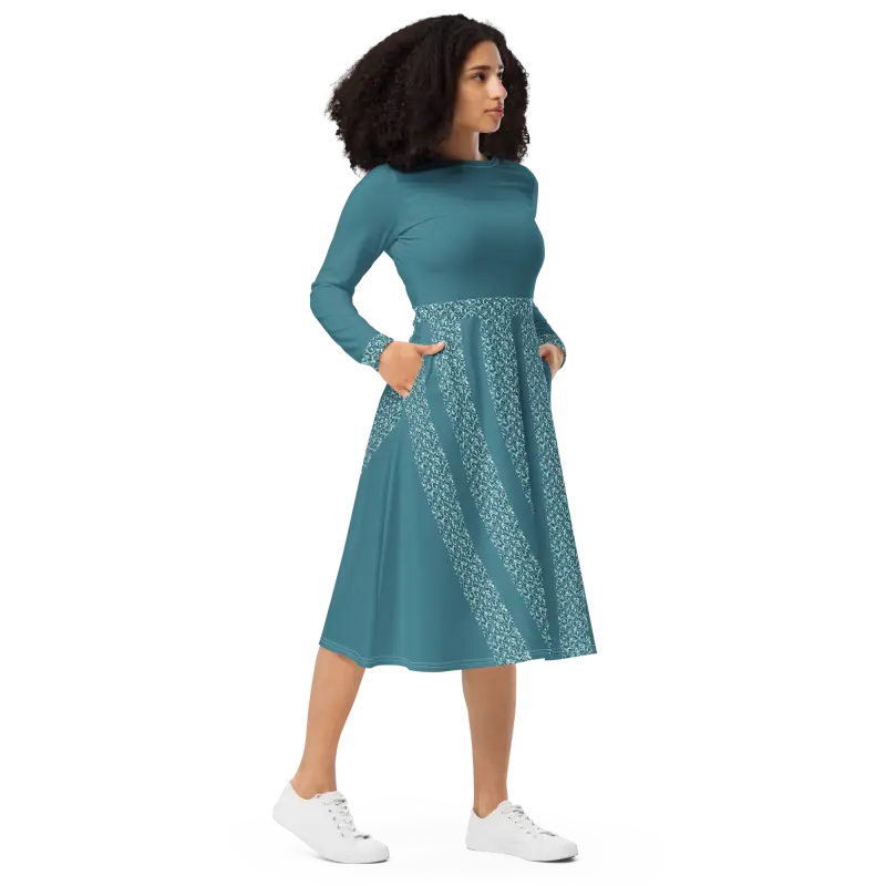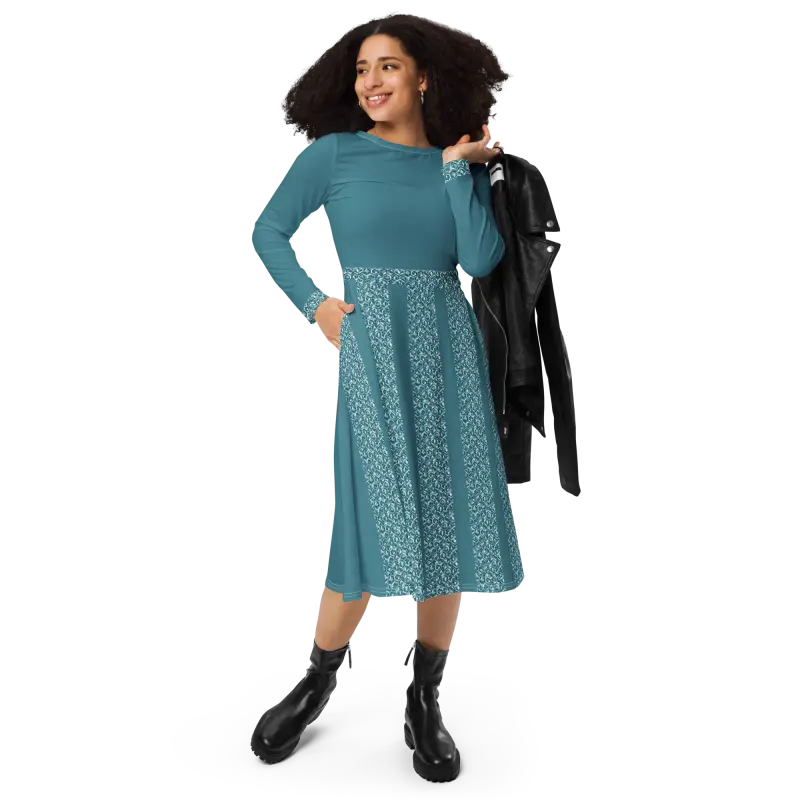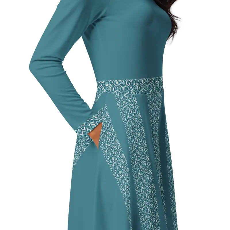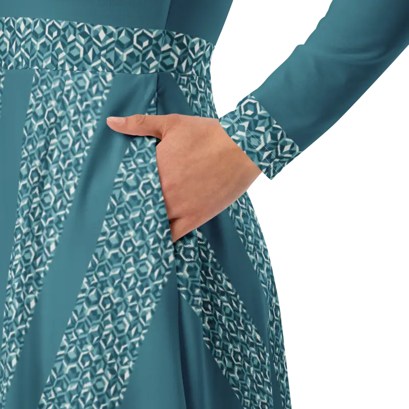 Teal Whirlwind Long Sleeve Midi Dress with Pockets