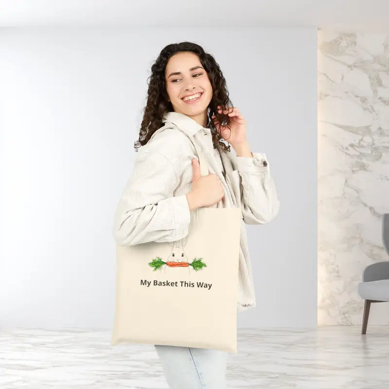Picture this: you're strolling through rows of fresh tulips and handmade goods on a sunny Saturday morning, and tucked comfortably over your shoulder is the most adorable spring easter market tote featuring a sweet bunny nose peeking out alongside fresh carrot greens. The playful My Basket This Way caption adds just the right amount of whimsy without being over-the-top, making you smile every time you catch a glimpse of it. This isn't just another boring shopping bag—it's a conversation starter that perfectly captures that fresh, optimistic energy of spring awakening. The watercolor-style illustration feels hand-painted and artistic, like something you'd find at a charming countryside boutique, and it instantly elevates even the most mundane grocery run into something special.