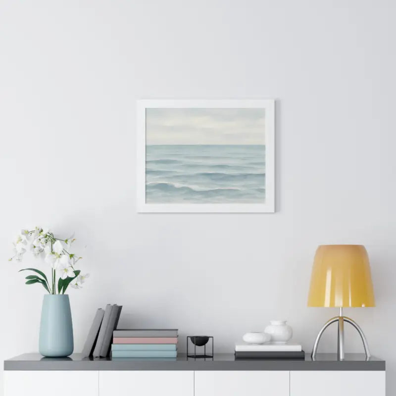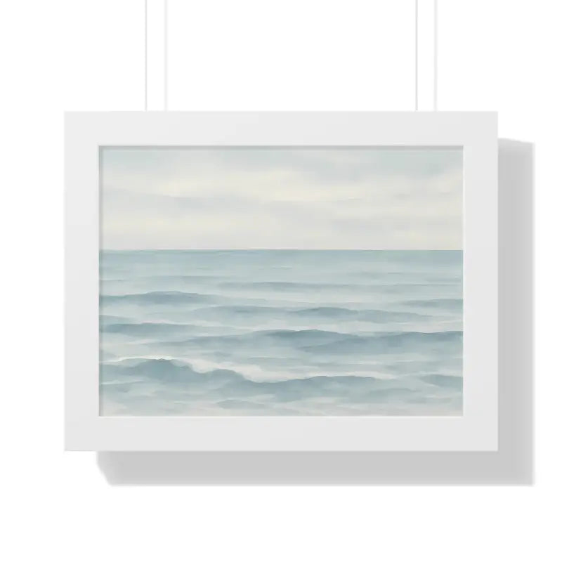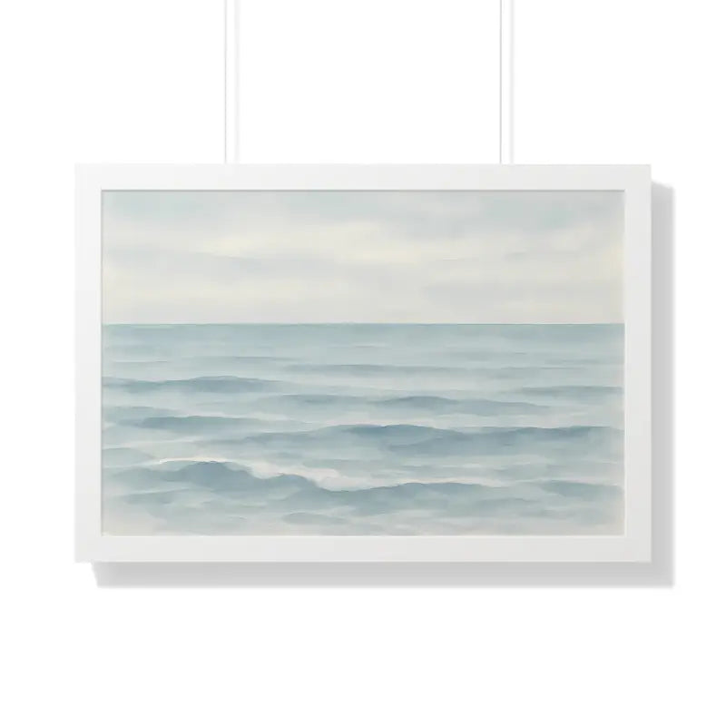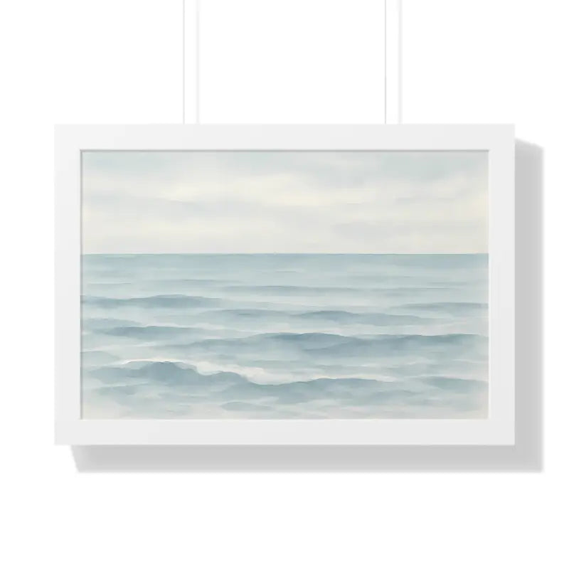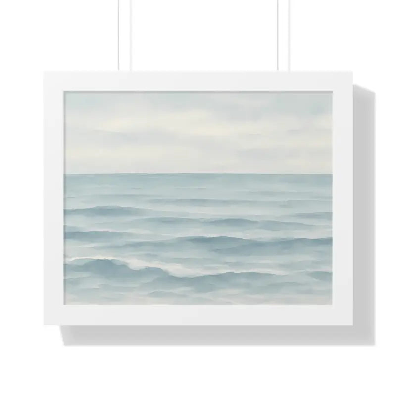 Print: Embrace serene soft ocean waves captured in a soothing color palette on this stunning horizontal framed poster.