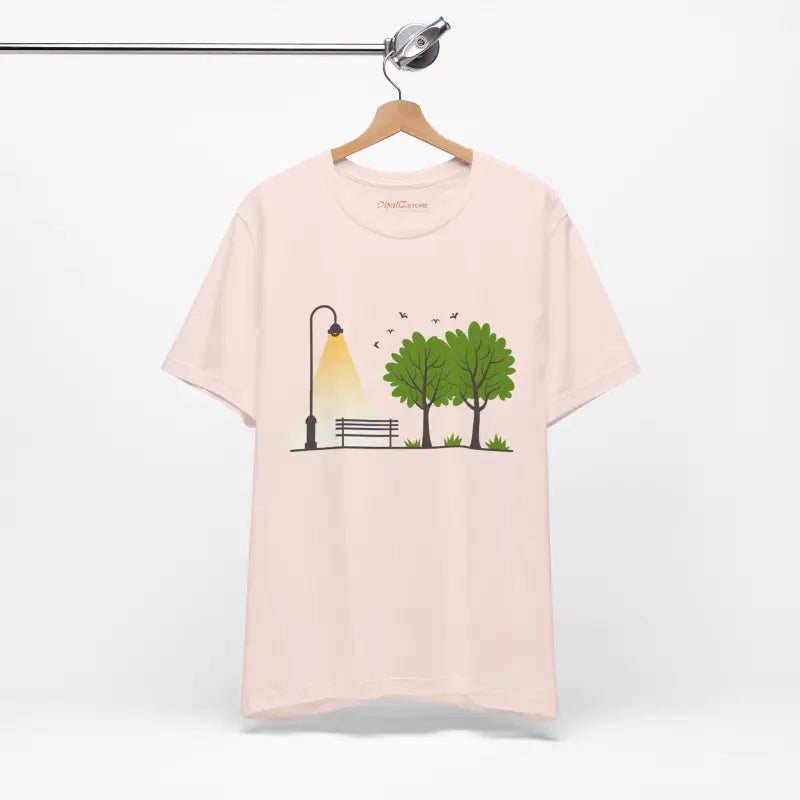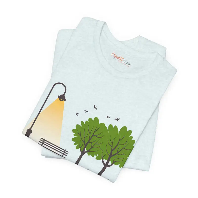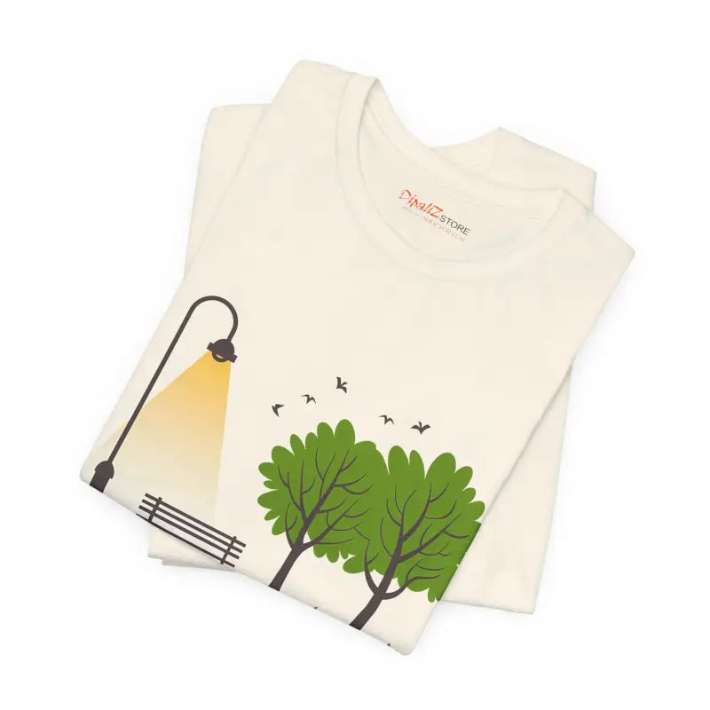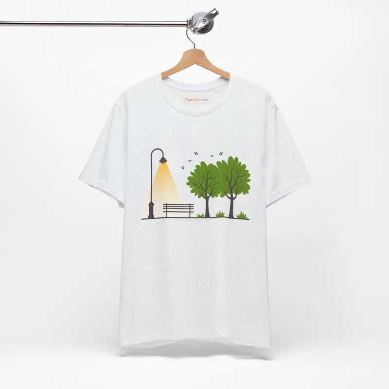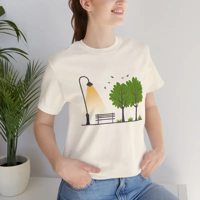 This Trees with lamp post, Unisex Jersey Short Sleeve t-shirt offers a familiar and cherished feel. Its gentle cotton and premium print create an enduring affection among wearers. These shirts feature ribbed knit collars for enhanced structure and taped shoulders for lasting fit. The dual side seams further preserve the garment's form.