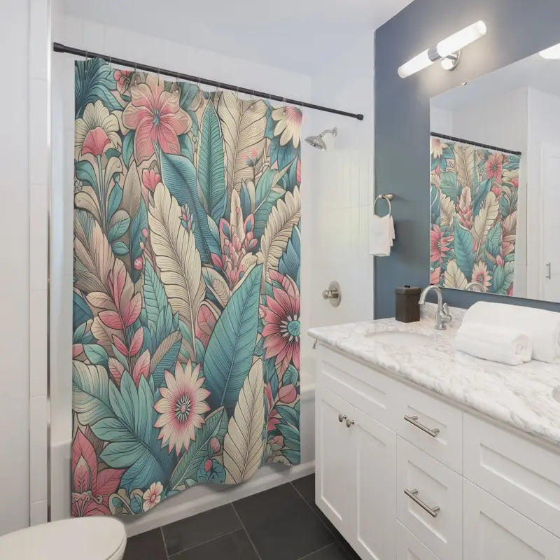 Introducing a shower curtain that brings the lush charm of the tropics right to your bathroom. This tropical floral shower transforms your daily routine into a refreshing retreat with its eye-catching mix of floral and leafy patterns. Its vibrant design makes this floral shower curtain a standout piece in any space, perfect for those who love nature and modern home decor.