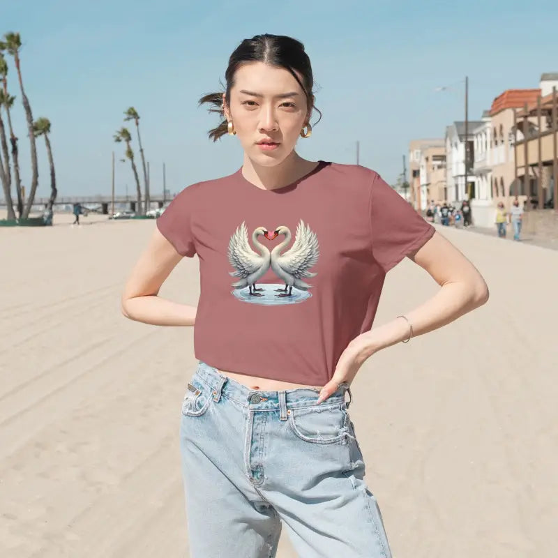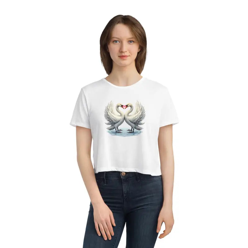 Ready to make this showstopper part of your collection? Add the Flowy Cropped Tee with Two Swans and Heart Design to your cart and bring the magic of elegance and carefree style to your everyday look. It's not just a purchase—it's a promise of charming moments every time you wear it. Snag yours now before they're all gone!