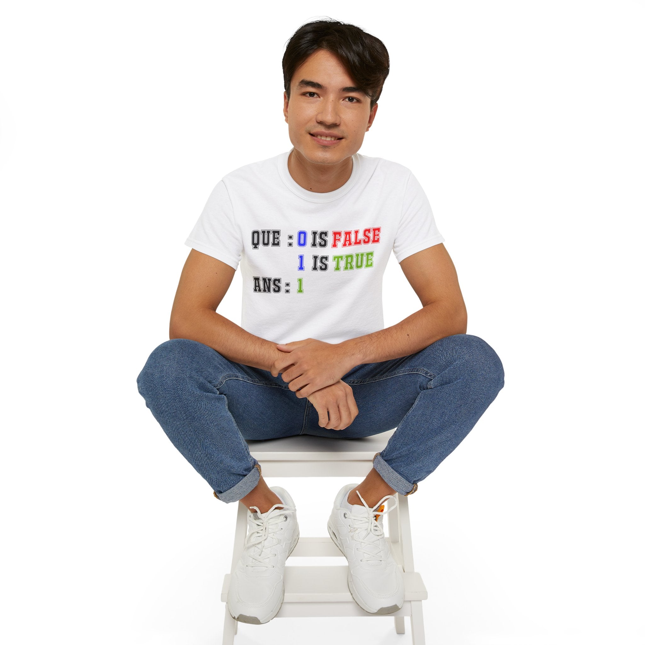 Programming true false, Unisex Ultra Cotton Tee. This unisex ultra cotton tee is a classic. Quality cotton construction means that designs are sure to shine. The shoulders are tapped for a good upper-body fit. There are no side seams, ensuring a clean, unbroken flow. The collar has ribbed knitting for improved elasticity. The materials that went into this product are sustainably sourced and economically friendly.