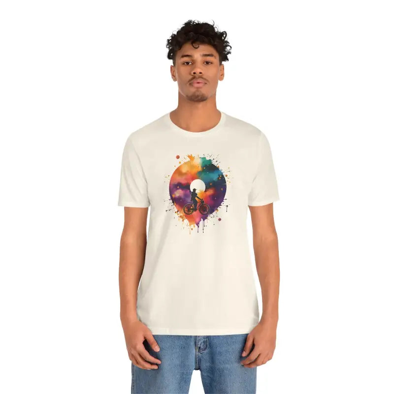 A bike rider, Soft cotton, Unisex Jersey Short Sleeve Tee. This timeless unisex jersey short sleeve t-shirt offers a familiar and cherished feel. Its gentle cotton and premium print create an enduring affection among wearers. These shirts feature ribbed knit collars for enhanced structure and taped shoulders for lasting fit. The dual side seams further preserve the garment's form.