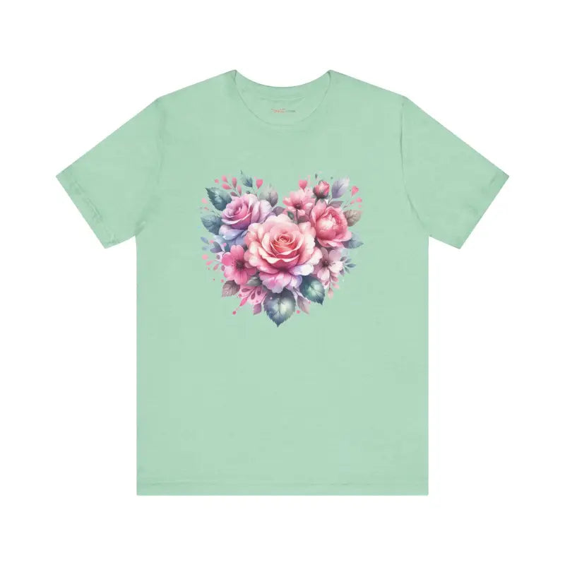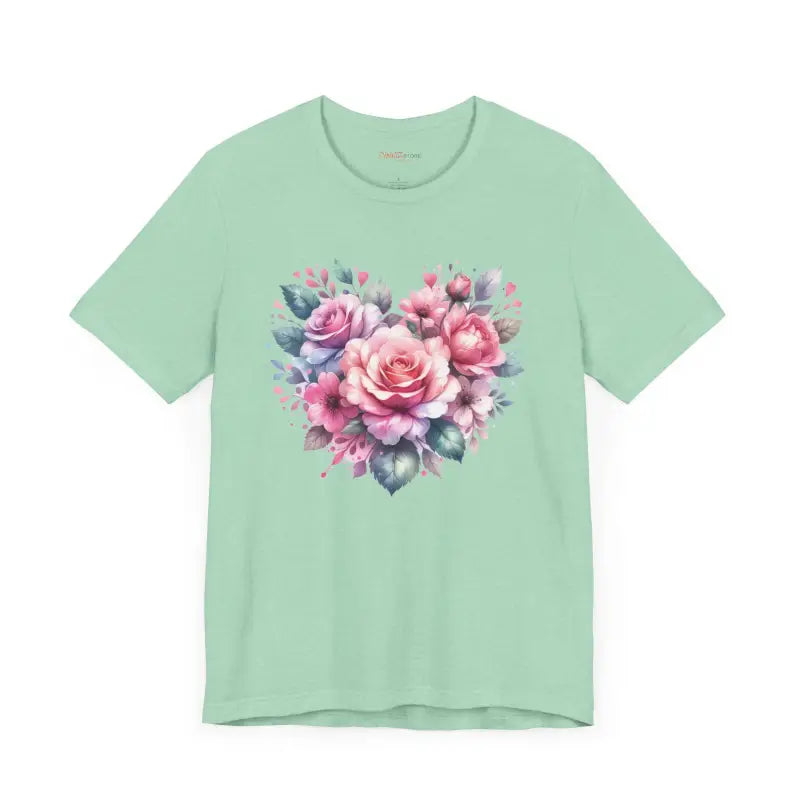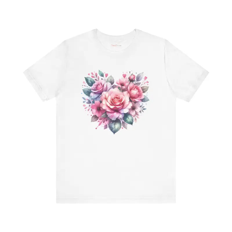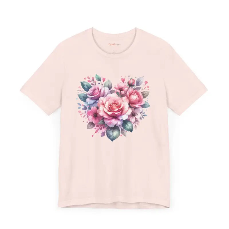 Step into a world of comfort and effortless style with the Cozy Hearts and Roses Jersey Short Sleeve Tee. This must-have cotton tee is designed to hug you with its softness while showcasing a beautiful heart-shaped floral design that speaks volumes in style and grace. Perfectly unisex, this short sleeve tee fits like a dream and looks great on everyone. It's crafted from premium soft cotton, ensuring that once you put it on, you'll never want to take it off. The high-quality print captures the intricate details of the hearts and roses, making it a standout piece but without the fuss of extra fussy care. Ribbed knit collars not only enhance durability, but add a polished touch to the look. With carefully designed tapered shoulders, it's all about the fit; this jersey short sleeve promises better wear over time. Plus, dual side seams play their part in keeping the tee's shape perfect wear after wear.